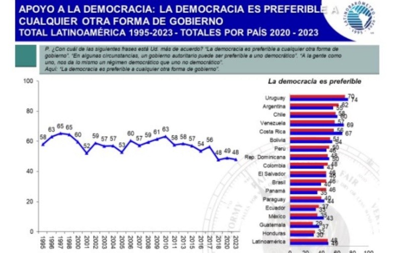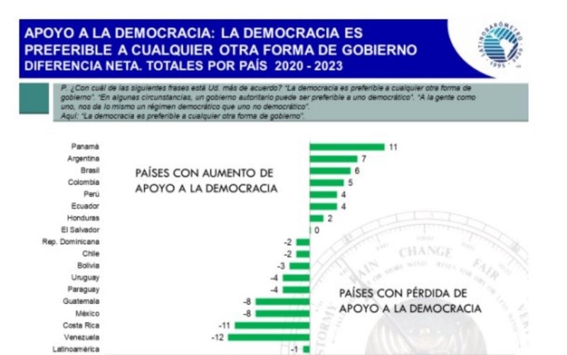 México es uno de los países con mayor retroceso en el apoyo a la democracia, mientras que el respaldo al autoritarismo creció entre la población en los últimos tres años, indicó un nuevo reporte sobre la situación política en América Latina difundido el viernes por la organización privada sin fines de lucro Latinobarómetro.El informe 2023 de la ONG, titulado "La recesión democrática de América Latina", señala que en México el respaldo a la democracia disminuyó del 43% en 2020 al 35% actual, lo que lo ubica entre los países con mayor retroceso -8 puntos porcentuales- junto con Venezuela, Costa Rica y Guatemala.Como contracara, entre los mexicanos creció 11 puntos porcentuales la idea del autoritarismo como alternativa, ya que un 33% de los consultados lo consideró un mecanismo viable, frente a un 22% hace tres años."En siete países latinoamericanos la mitad de los ciudadanos o más creen que los partidos políticos no son indispensables para la democracia", alertó el documento de Latinobarómetro.México se ubica en el top 5 de los países más descreídos del sistema político-partidario a nivel regional: Panamá es el estado latinoamericano donde más personas -un 64%- creen que los partidos no son indispensables, mientras que esas cifras son del 60% en Colombia, 59% en Ecuador y 58% en México y Paraguay. "Una democracia sin partidos es uno de los errores conceptuales más graves que tiene la democracia latinoamericana", añadió el reporte.Este año fue la primera vez que el informe preguntó a los latinoamericanos si los partidos políticos funcionan bien y la respuesta fue contundente, en contra: el 77% está en desacuerdo con la afirmación, en contraste con solo el 21% que coincide con ella.Entre los mexicanos, el 62% estuvo en desacuerdo con la idea de un buen funcionamiento de los partidos, frente a un 36% que se mostró a favor. El estudio ubicó a México entre "los países con democracias débiles o en retroceso", tanto porque la situación es vulnerable como porque las actitudes hacia esta forma de gobierno retrocedieron.El balance respondió al incremento en el apoyo al autoritarismo y la pérdida de respaldo a la democracia, pero también un aumento de la indiferencia sobre el tipo de régimen de gobierno."En otras palabras, algo más de un tercio apoya la democracia (35%), cerca de otro tercio es indiferente por el tipo de régimen (28%) y el otro tercio apoya una opción autoritaria (33%). La democracia se ha deteriorado mucho desde 2020 en México, según la evolución negativa de estos indicadores. Hay aquí también tierra fértil para autoritarismos y populismos", concluyó el reporte. Ese incremento en el apoyo al autoritarismo en México "enciende las alarmas", según Latinobarómetro.En referencia a los personalismos, el principal impedimento considerado por la ONG para un desarrollo político sano en la región, el informe señala que "un factor recurrente de transgresión a las normas democráticas es que el Presidente de la República se considere indispensable para su país y modifique las reglas de reelección a fin de acceder a un nuevo período presidencial, más allá de lo establecido".Latinobarómetro mencionó, como otra variante de esas transgresiones, los "intentos de permanecer en el poder no para sí mismos, pero sí para su partido"."Hay que observar detenidamente a México en un momento donde su presidente, Andrés Manuel López Obrador, intenta modificar las leyes que rigen las elecciones para mejorar las opciones de su partido. Es una acción claramente autoritaria", precisó el reporte.Otra de las señales de alerta que surgen del análisis elaborado por la ONG con sede en Santiago de Chile es que la insatisfacción con la democracia alcanza el 61% en México, frente a un nivel de satisfacción con este sistema político que apenas suma el 37%.La corporación Latinobarómetro investiga el desarrollo de la democracia, la economía y la sociedad mediante este estudio de opinión pública, que realiza anualmente unas 20 mil entrevistas en 18 países de América Latina.