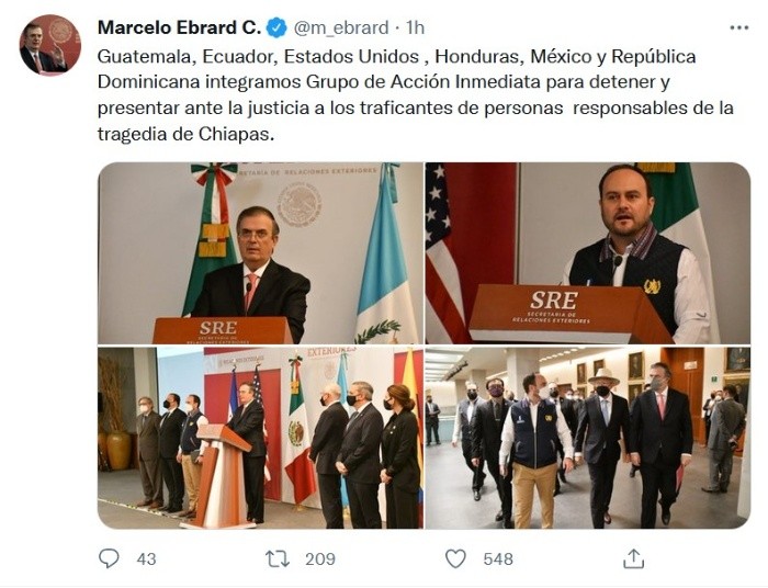 México anunció este viernes, junto a países de Centroamérica y por propuesta de Guatemala, la creación de un grupo de acción contra la red de traficantes de personas responsables del accidente en Chiapas en el que murieron 50 migrantes el jueves."Los países de la región, a propuesta de Guatemala anunciamos la creación del Grupo de Acción Inmediata contra la red de traficantes de personas responsables de la tragedia en Chiapas, para investigar, identificar, aprehender y presentar ante la justicia a los integrantes y mandos de la organización criminal trasnacional responsable de esta tragedia humana", dijo el canciller de México, Marcelo Ebrard, en conferencia de prensa.El secretario de Relaciones Exteriores detalló que con este mecanismo, que cuenta hasta el momento con el respaldo de los Gobiernos de Guatemala, Ecuador, Estados Unidos, Honduras, México, Nicaragua y República Dominicana, se comprometen de manera compartida a aplicar la ley contra las personas responsables de los fallecimientos.Además, dijo, trabajarán de manera coordinada para combatir el tráfico de personas en todas sus manifestaciones.También aclaró que a partir de ahora cada país asumirá la investigación en su territorio y, además de las herramientas existentes de cooperación jurídica, se establecerá un mecanismo para el intercambio de información "de manera directa y fluida" para así dar resultados "a los deudos y a la opinión pública en general"."Los países de la región reiteramos nuestro respaldo a la migración segura, ordenada y regular, y reiteramos nuestro repudio a la acción a las redes criminales internacionales de trafico de personas. No permitiremos la impunidad", sentenció Ebrard.En la conferencia de prensa, su homónimo de Guatemala, Pedro Brolo, coincidió con Ebrard en la necesidad de atender las causas de la migración."Para luchar contra la migración ilegal es imprescindible que reunamos esfuerzos para construir muros de prosperidad para que se generen condiciones para que las personas se desarrollen en sus comunidades y no se sientan motivados a arriesgar su vida", expuso en su nombre y en nombre del presidente de Guatemala, Alejandro Giammattei.También propuso a los Gobiernos de México y Estados Unidos a que "en una fecha pronta" se realice una reunión de alto nivel entre los tres países para alinear y homologar la política migratoria.JM