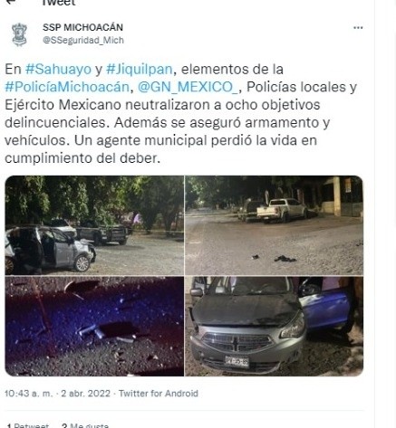 Al menos cinco personas murieron tras un enfrentamiento ocurrido entre civiles armados y elementos de la Guardia Nacional, la Secretaría de Seguridad Pública y la Policía Municipal en Jiquilpan, Michoacán.Según la Fiscalía General del Estado (FGE), el ataque se registró durante la noche del viernes y primeras horas de este día cuando ocurrió la balacera entre los oficiales que se encontraban en un recorrido. Luego de los ataques, los hombres armados subieron a un vehículo para escapar, por lo que se suscitó una persecución. El vehículo volcó provocando la muerte de los cuatro ocupantes.La autoridad halló armas y equipo táctico en la camioneta de los agresores.El quinto fallecido fue un policía que resultó lesionado y murió en un hospital en el municipio de Sahuayo a consecuencia de las heridas.