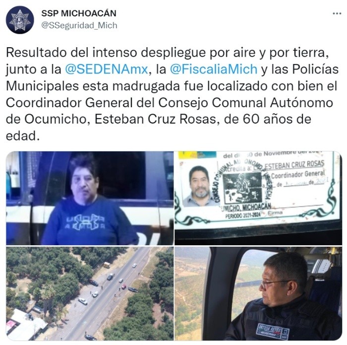 La Fiscalía de Michoacán informó esta madrugada de sábado que el concejal y locutor de Ocumicho, Esteban Cruz Rosas, fue liberado con vida.La FGE indicó que la privación ilegal de la libertad de Cruz Rosas fue el pasado jueves en el municipio de Tangancícuaro.La Fiscalía estatal, dijo que una vez liberado, el representante indígena fue atendido en calidad de víctima, y que la institución continuará con las investigaciones del hecho.El Consejo Supremo Indígena de Michoacán, informó que este jueves fue privado de su libertad un concejal del gobierno comunal de Ocumicho, municipio de Charapan, donde también es locutor de radio.Se trata de Esteban Cruz Rosas, coordinador del Consejo de Gobierno Comunal de Ocumicho y locutor de la Radio comunitaria de ese lugar.La ficha de desaparición señala que Cruz Rosas fue visto por última vez en el tramo carretero Ocumicho-Tangancícuaro, a la altura de San José de Gracia, municipio de Marcos Castellanos, ubicado en el llamado corredor de la muerte.El CSIM confirmó que ya fue presentada la denuncia en la Fiscalía General del Estado.Dijo que también reportaron el hecho al gobierno estatal y al Federal, sin que hasta el momento haya resultados de la búsqueda.El Concejo Supremo Indígena convocó a las comunidades originarias a la toma de carreteras hasta la presentación con vida de Esteban Cruz.OA