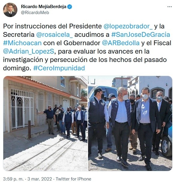 Este jueves el subsecretario de Seguridad Pública Federal, Ricardo Mejía Berdeja; el gobernador de Michoacán, Alfredo Ramírez Bedolla y el fiscal general del estado, Adrián López Solís, visitaron la comunidad de San José de Gracia donde más de diez personas fueron asesinadas por un grupo armado.Lo anterior, para supervisar los avances de la investigación relacionada con los hechos ocurridos el 27 de febrero en el municipio de Marcos Castellanos, y garantizar que las actuaciones que se lleven a cabo sean apegadas a los protocolos establecidos en la ley como parte del Plan Cero Impunidad, informó la Secretaría de Seguridad y Protección Ciudadana (SSPC).La dependencia aseguró que durante la visita los gobiernos estatal y federal externaron su interés en esclarecer los hechos y que no queden impunes. Indicó que el gobernador, Alfredo Ramírez Bedolla instruyó al secretario de Seguridad Pública Estatal, el general José Alfredo Ortega Reyes, a fortalecer la estrategia de seguridad que coadyuve a restablecer la paz y tranquilidad de los habitantes de Marcos Castellanos y la región.Por su parte, señaló la SSPC, el subsecretario Mejía Berdeja reiteró la disposición del ejecutivo federal para mantener y en su caso, si es necesario, fortalecer la colaboración que se ha brindado en la investigación.Agregó que, luego de exponer avances de la investigación, el fiscal Adrián López Solís agradeció el apoyo de equipo especial asignado por el gobierno federal, ya que la colaboración de la SSPC y la Coordinación Nacional Antisecuestro (Conase), ha sido determinante para robustecer la indagatoria, bajo la premisa de salvaguardar el acceso a la justicia y que los responsables reciban un castigo.Indicó que al momento se aseguró la comunidad La Estancia un inmueble que era utilizado presumiblemente para la fabricación y almacenamiento de explosivos, así como artefactos de fabricación casera -conocidos como papas- y varios cilindros con estabilizador para lanzamiento con drones.Los funcionarios acordaron mantener la comunicación abierta para el intercambio de información que abone en las tareas que se llevan a cabo y dar seguimiento a la investigación. AHG