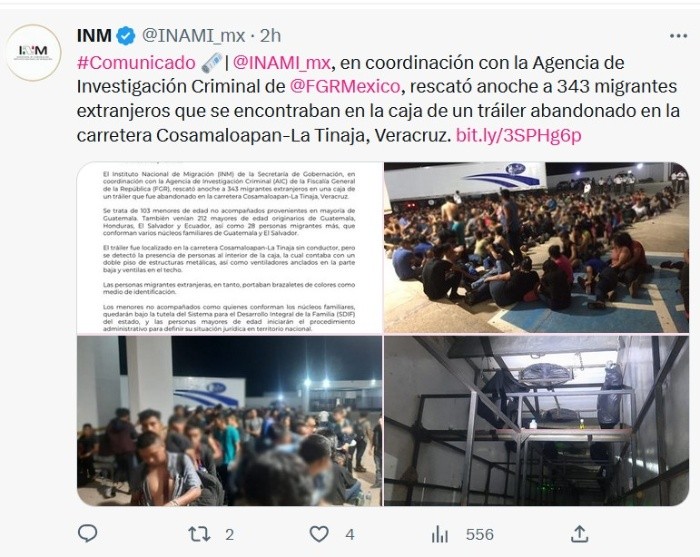El Instituto Nacional de Migración (INM) rescató a 343 migrantes que se encontraban en la caja de un tráiler abandonado en Veracruz, de los que 103 son menores de edad no acompañados y provienen de Guatemala, Honduras, El Salvador y Ecuador.En coordinación con la Agencia de Investigación Criminal (AIC) de la Fiscalía General de la República (FGR), el INM encontró a los migrantes la noche del pasado domingo en la carretera Cosamaloapan-La Tinaja, informó la institución este lunes en un comunicado."El tráiler fue localizado sin conductor, pero se detectó la presencia de personas al interior de la caja, la cual contaba con un doble piso de estructuras metálicas, así como ventiladores anclados en la parte baja y ventilas en el techo", detalló el INM. Además, los migrantes portaban brazaletes de colores como medio de identificación.De los 343 migrantes, 212 son mayores de edad, 103 son menores no acompañados y 28 pertenecen a varios núcleos familiares.Los menores provienen en su mayoría de Guatemala; los adultos de Guatemala, Honduras, El Salvador y Ecuador, y los núcleos familiares de Guatemala y El Salvador.Tanto los menores no acompañados como las familias quedaron bajo la tutela del Sistema para el Desarrollo Integral de la Familia (SDIF), mientras que los adultos iniciaron un procedimiento administrativo para definir su situación jurídica en México.La pasada semana, informó también el INM, 79 migrantes fueron localizados en Tijuana, hacinados en varias habitaciones de hotel.JM