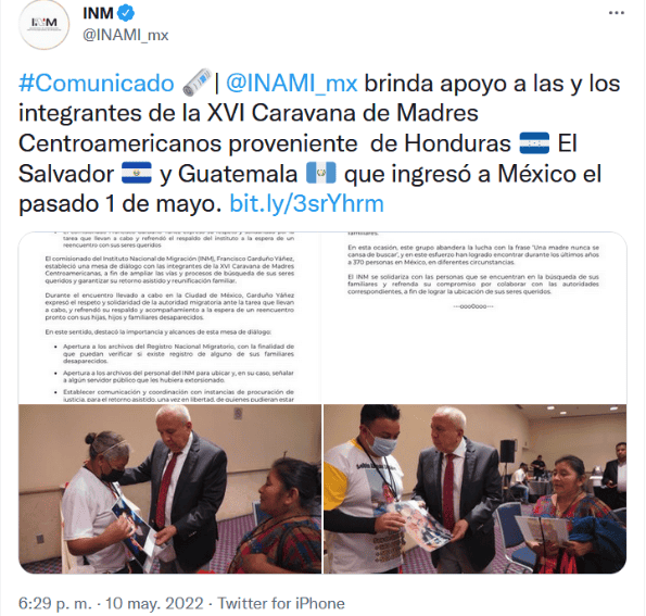 El Gobierno de México ofreció varias medidas de apoyo para una caravana de mujeres centroamericanas que ingresó al país el pasado 1 de mayo para buscar a sus familiares.La Caravana de Madres Centroamericanas es un movimiento que se organiza desde 2004 para buscar a sus familiares migrantes desaparecidos en México.El Instituto Nacional de Migración (INM) dijo en un comunicado que tras reunirse con las integrantes de la caravana en Ciudad de México ofreció a las mujeres abrir los archivos del Registro Nacional Migratorio "para que puedan verificar si existe registro de alguno de sus familiares desaparecidos".Agregó que también se ofreció a abrir archivos de su personal para que las mujeres puedan señalar si algún servidor público las hubiera extorsionado.Dijo asimismo que se renovarán las tarjetas humanitarias de quienes integran la caravana y que se harán trámites para las mujeres que se sumen.El INM indicó que se coordinará con autoridades judiciales para el retorno asistido, una vez en libertad, de los migrantes que pudieran estar en la cárcel.El Gobierno dijo que cuentan con documentos "para recorrer por 180 días las rutas migrantes, albergues, cárceles y panteones, a fin de poder localizar a sus familiares".Cientos de migrantes, principalmente de Honduras, El Salvador y Guatemala, cruzan México cada año con la intención de llegar a Estados Unidos.Sin embargo, en su travesía por México enfrentan numerosos peligros como las extorsiones de agentes migratorios y el acecho de grupos criminales.Para frenar la oleada migratoria, el Gobierno de México ha apostado cientos de militares en sus fronteras norte y sur.gc