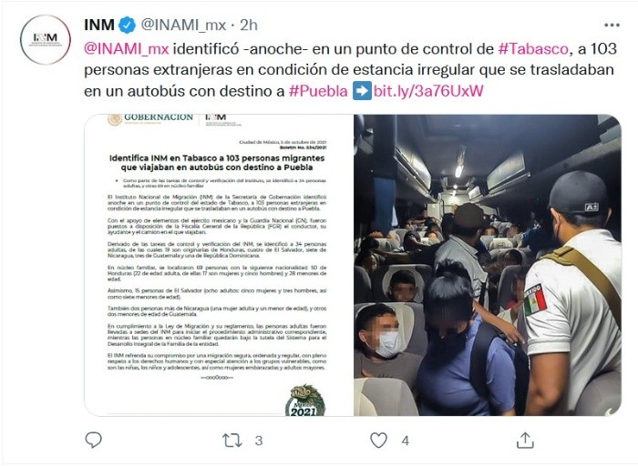 Un total de 103 migrantes centroamericanos, entre ellos 38 menores, fueron detenidos por agentes del Instituto Nacional de Migración (INM) de México en un punto de control de Tabasco, informó este martes la institución.En un comunicado, el INM, dependiente de la Secretaría de Gobernación, indicó que el lunes por la noche los agentes identificaron en el punto de control a 103 personas extranjeras en condición de estancia irregular que se trasladaban en un autobús con destino a Puebla.Explicó que en el punto de revisión se identificó a 34 personas adultas, de las cuales 19 son originarias de Honduras, cuatro de El Salvador, siete de Nicaragua, tres de Guatemala y una de República Dominicana.En tanto, en núcleo familiar, se identificó a 69 personas, 50 de Honduras (22 adultos, de ellas 17 son mujeres y cinco hombres) y 28 menores de edad.Además de otras 15 personas de El Salvador, entre ellos, ocho adultos: cinco mujeres y tres hombres, así como siete menores, y dos personas más de Nicaragua, una mujer adulta y un menor, y dos menores de Guatemala.EL INM señaló que el conductor, su ayudante y el camión en el que viajaban fueron puestos a disposición de la Fiscalía General de la República (FGR).En cumplimiento a la Ley de Migración, las personas adultas fueron llevadas a sedes del INM para iniciar el procedimiento administrativo correspondiente, mientras las personas en núcleo familiar quedarán bajo la tutela del Sistema para el Desarrollo Integral de la Familia (DIF) de Tabasco.Si te interesó esta noticia y quieres saber más, entonces descarga y descubre INFORMAPlus, la aplicación digital de EL INFORMADOR, en donde tenemos contenidos exclusivos, seleccionados por nuestros editores, para darles una experiencia más completa a los lectores. Si eres suscriptor de EL INFORMADOR tu acceso está incluido, solicítalo al 33 3678-7777.Descarga la aplicación y pruébala GRATIS por treinta días.Para iOS: https://apple.co/35jaVgbPara Android: https://bit.ly/3gwVSEVJM