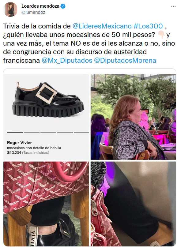 La diputada de Morena, Patricia Armendáriz, fue criticada en redes sociales por usar mocasines de 50 mil pesos.Durante un evento de la IP, la empresaria vestía los zapatos del diseñador Roger Vivier y usaba una bolsa de Goyard, que también ronda los 50 mil pesos.Armendáriz es empresaria y ha sido vicepresidenta de la Comisión Nacional Bancaria (CNB) y directora de Banorte. Paty, como le gusta que le llamen, participó en el programa "Shark Tank", lo que la llevó a ser conocida en la televisión.La periodista Lourdes Mendoza señaló que el precio de los zapatos no corresponde a la "pobreza franciscana", que pregona el Presidente Andrés Manuel López Obrador y su partido Morena, al que Armendáriz pertenece como diputada."Y una vez más, el tema NO es de si les alcanza o no, sino de congruencia con su discurso de austeridad franciscana", dijo Mendoza.Armendáriz es diputada por representación proporcional desde el 2021 y hasta el 2024.Sin embargo, hay quienes defienden a la empresaria, al señalar que ella tiene dinero para comprarse esos zapatos e incluso la bolsa."La austeridad republicana se refiere al gasto público no al personal de cada diputado. Ellos tienen su sueldo, son libres de usarlo como les plazca...", "desde mucho antes ha sido empresaria", "ella se los compra con su dinero", le comentaron algunos de los seguidores a la periodista.OA