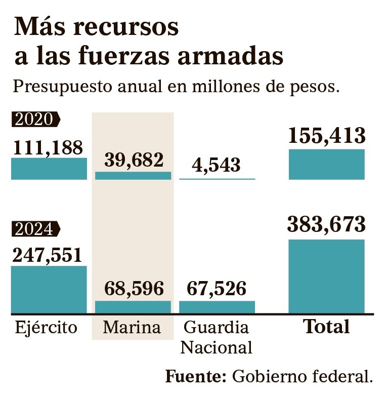 El sexenio de Andrés Manuel López Obrador apostó por fortalecer a la Secretaría de la Defensa Nacional y la Marina en presupuesto y en funciones, como estar al mando de todos los aeropuertos, aduanas o puertos. Y esta semana se consumará el último proyecto del Presidente: el 19 de septiembre se discutirá en la Cámara de Diputados la propuesta para que la Guardia Nacional pase al mando del Ejército, con la intención de blindar a la corporación, incluyendo la salida de todos los ex policías federales que actualmente conforman el cuerpo élite.En 2020, el Congreso de la Unión autorizó un presupuesto de 155 mil 413 millones para la Sedena, Marina y Guardia Nacional, pero este año se duplicó a más de 383 mil millones.Sobre la Guardia Nacional, inició operaciones en 2020 con 40 mil elementos desplegados en 150 regiones con altos niveles de violencia o inseguridad del país. Hoy cuenta con 135 mil agentes “bien formados, disciplinados y entregados a garantizar la paz y la seguridad pública”, presume Andrés Manuel López Obrador, distribuidos en 594 regiones estratégicas. El pasado 5 de febrero, López Obrador presentó una iniciativa que modifica 12 artículos de la Constitución. El dictamen que se discutirá esta semana en el Congreso federal argumenta el paso de la Guardia Nacional al Ejército de la siguiente manera: “De acuerdo con la Encuesta Nacional de Seguridad Pública 2023 del Inegi, la población percibió como efectivo o muy efectivo el desempeño de la Guardia Nacional en sus labores para prevenir y combatir la delincuencia en 74%, mientras que calificó a la Armada y al Ejército con porcentajes de 85.6% y 83.5%, respectivamente. En contraste, esta percepción fue de sólo 54.1% en el caso de las Policías estatales y 48.6% respecto a las Policías municipales”.Remarca que las tres instituciones tienen los mayores niveles de percepción de confianza y aceptación entre la población: en promedio, nueve de cada 10 confían en éstas.Mientras los partidos de oposición y organismos civiles, como México Unido Contra la Delincuencia o Causa en Común, alertan sobre la militarización del país, “la iniciativa propone que quede a cargo de la Sedena, pero dicha adscripción no se refiere a que la corporación cumplirá con funciones del Ejército en Estado de guerra ni de excepción, sino que se regirá por normas y principios de seguridad pública. Contrario al uso de las Fuerzas Armadas del pasado, están obligadas a respetar los derechos humanos y sólo actúan en el marco de la ley. La reforma obedece a una disciplina que, en cuanto a su formación, es militar, pero en cuanto a su acción, es policial”, se indica en el dictamen. CT