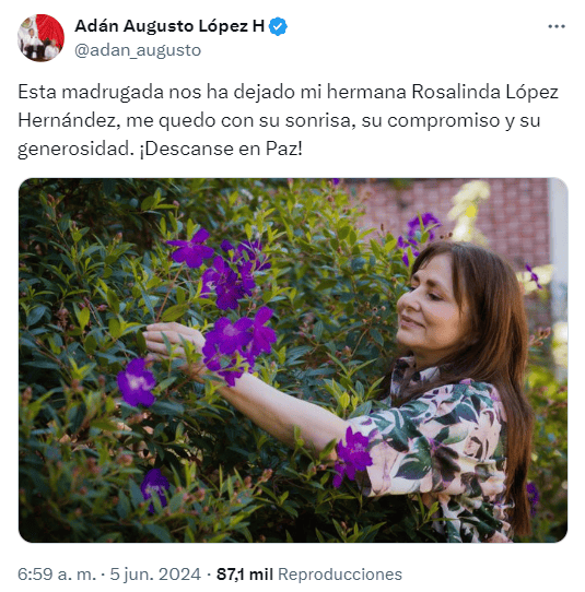 A través de sus redes sociales, el exsecretario de Gobernación, Adán Augusto López Hernández, informó la muerte de su hermana, Rosalinda, quien también era esposa del gobernador de Chiapas, Rutilio Escandón.Con un mensaje en su cuenta de X, Adán Augusto (@adan_augusto) dijo: "Me quedo con su sonrisa, su compromiso y su generosidad. ¡Descanse en Paz!".En la cuenta de Rosalinda López se publicó: "Rodeada del amor de sus seres queridos, el día de hoy ha fallecido nuestra queridísima hermana Rosalinda López Hernández. Mujer generosa, amorosa, noble, guerrera incansable. Bendecida y agradecida por el cariño de quienes la conocieron. Siempre estarás con nosotros. Hasta siempre Rosa. Silvia, Adán Augusto y Melchor".Rosalinda López también era virtual candidata electa al Senado de la República por la coalición Sigamos Haciendo Historia en Tabasco. Era de una de las políticas más involucradas en el actual gobierno liderado por Morena. Antes, fue diputada local, diputada federal, senadora y administradora del SAT.Hasta el momento no se han detallado las causas de su muerte.También en sus redes sociales, la virtual ganadora de la elección presidencial, Claudia Sheinbaum, publicó un sentido mensaje: "Lamento profundamente la partida de Rosalinda López Hernández. Compañera alegre, trabajadora, de convicciones. Mi solidaridad y cariño a Adán Augusto, Rutilio y a todas y todos los familiares, amigos y compañeros. Hasta siempre querida Rosalinda.".Por su parte, en la mañanera de hoy en Palacio Nacional, el Presidente Andrés Manuel López Obrador inició la conferencia de prensa con palabras sobre el deceso. "Falleció nuestra hermana, compañera Rosalinda López Hernández", dijo el Mandatario.*Mantente al día con las noticias, únete a nuestro canal de WhatsAppOF