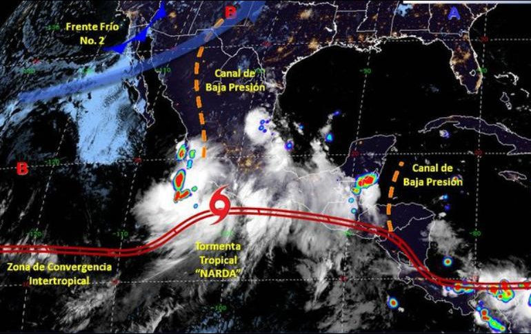 El Servicio Meteorológico Nacional (SMN) señaló esta mañana -07:00 horas- que "Narda" avanza con vientos máximos sostenidos de 75 kilómetros por hora y 95, y desplazamiento hacia el noroeste a 13 kilómetros por hora paralelo al litoral del occidente del país.El SMN, dependiente de la Comisión Nacional del Agua (Conagua), indicó que este día, la tormenta tropical se ubicará muy próxima a las costas de Colima y Jalisco, originando lluvias intensas a puntuales torrenciales acompañadas de descargas eléctricas en zonas de Jalisco, Colima, Michoacán y Guerrero, así como muy fuertes a intensas en Nayarit y Oaxaca.Agregó que las precipitaciones podrán causar deslaves, desbordamiento de ríos y arroyos e inundaciones, además de rachas fuertes de viento y oleaje elevado en sus costas. El sistema mantendrá desplazamiento paralelo a las costas del Pacífico Central Mexicano, con trayectoria hacia el Golfo de California.Explicó que las bandas nubosas de dicho sistema interaccionarán con canales de baja presión que se extenderán sobre el noroeste y sureste del territorio nacional, originando lluvias fuertes a muy fuertes acompañadas de descargas eléctricas.El nuevo frente frío número dos se extenderá sobre el norte de Baja California y noroeste de Sonora y ocasionará rachas de viento superiores a 50 kilómetros por hora, añadió el pronóstico meteorológico.GC