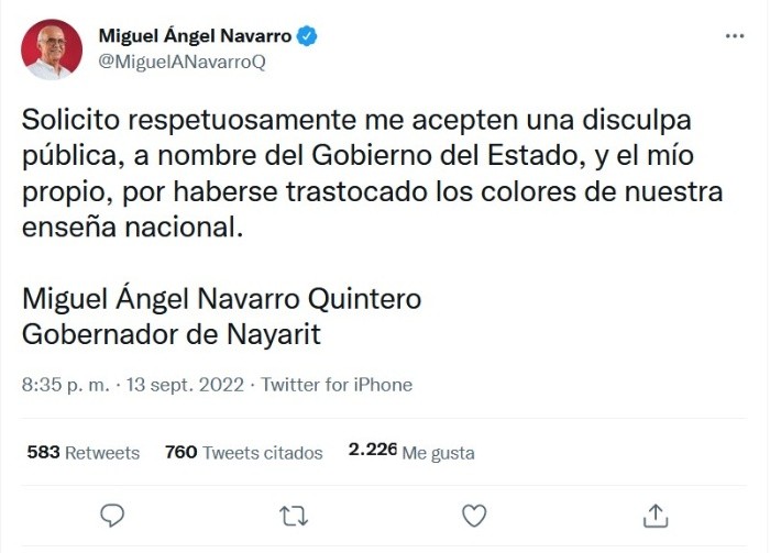 Tras cambiar los colores de la bandera nacional y sustituir el verde y el rojo por el color guinda para la conmemoración de la gesta de los Niños Héroes en Nayarit, Mario Javier Figueroa Betancourt, quien se desempeñaba como director general de Imagen Gubernamental, presentó su renuncia al cargo la noche de este martes.En tanto, la mañana de este miércoles, el gobernador Miguel Ángel Navarro volvió a ofrecer una disculpa pública por lo ocurrido y asumió la responsabilidad del hecho."Yo hago la solicitud, a través de ustedes, de que me acepten una disculpa pública por haber trastocado los colores de nuestra enseña patria; yo respeto el lábaro patrio, y de ninguna manera debió haberse hecho, pero hay, insisto, imponderables que están fuera de mi alcance, pero yo me hago responsable", señaló el mandatario ante medios de comunicación.La mañana de este martes, en el acto conmemorativo celebrado en el parque Juan Escutia, en Tepic, se colocaron ocho grandes banderas con franjas guindas sustituyendo al verde y rojo, lo que fue considerado una violación a la Ley sobre el escudo, la bandera y el himno nacional.Además, se criticó el hecho de que se colocara el color guinda en la bandera, pues éste se identifica con el partido Morena, al que pertenece Navarro.El "error" fue atribuido a la oficina de Imagen Gubernamental del Poder Ejecutivo, encabezada por Figueroa Betancourt, quien tras las críticas provocadas a la administración de Navarro Quintero por el hecho decidió dejar el cargo.JM