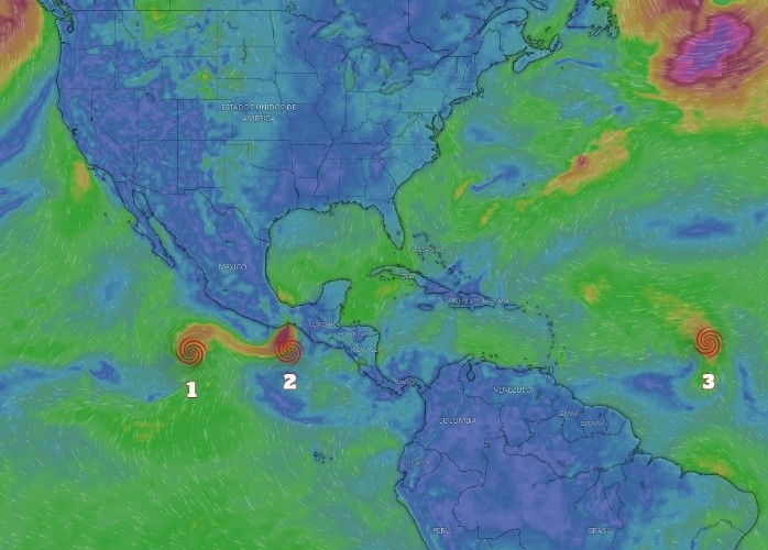 México se encuentra rodeado de tres fenómenos naturales que tienen altas probabilidades de desarrollo ciclónico este martes 17 de octubre, según información del Servicio Meteorológico Nacional (SMN), fuente oficial del Gobierno de México en materia climática.El SMN informó de los dos primeros sistemas:1.- Zona de baja presión al sur de Jalisco, mantiene 90% de probabilidad para desarrollo ciclónico en 48 horas y en 7 días. Se localiza aproximadamente a 680 kilómetros al sur-suroeste de Punta San Telmo, Michoacán; y a 800 kilómetros al sur de Playa Pérula, Jalisco; y se desplaza lentamente hacia el oeste noroeste.2.- Zona de baja presión sobre la costa occidental de Nicaragua y el sureste de México, mantiene 10% de probabilidad para desarrollo ciclónico en 48 horas y 70% de probabilidad para desarrollo ciclónico en 7 días. Se localiza a 700 kilómetros al este-sureste de la desembocadura del Río Suchiate (frontera entre México y Guatemala).Pero también observa un tercero:3.- Zona de baja presión al este de las Islas de Barlovento, incrementa a 60% de probabilidad para desarrollo ciclónico en 48 horas y mantiene 80% en 7 días. Se localiza aproximadamente a 5 mil 010 kilómetros al este de las costas de Quintana Roo y se desplaza hacia el oeste.Hoy martes, la zona de baja presión con alta probabilidad de desarrollo ciclónico o posible ciclón tropical "Norma" se localizará al sur de las costas de Jalisco y Colima, sus desprendimientos nubosos incrementarán la probabilidad de lluvias fuertes a puntuales muy fuertes en el occidente y sur del país, siendo puntuales intensas en Jalisco (sur), Colima, Michoacán y Guerrero.Por su parte, se espera que a partir del miércoles el centro de baja presión con probabilidad de desarrollo ciclónico se localice al sur de las costas de Oaxaca, manteniéndose en estrecha vigilancia. A su vez, prevalecerá el escaso potencial de lluvias sobre estados del noroeste, norte y noreste de México. De continuar su evolución, se podría desarrollar un nuevo ciclón tropical que llevaría el nombre de "Otis".Así se ven los tres sistemas:* * * Mantente al día con las noticias, únete a nuestro canal de Whatsapp * * *Con información Servicio Meteorológico NacionalOA
