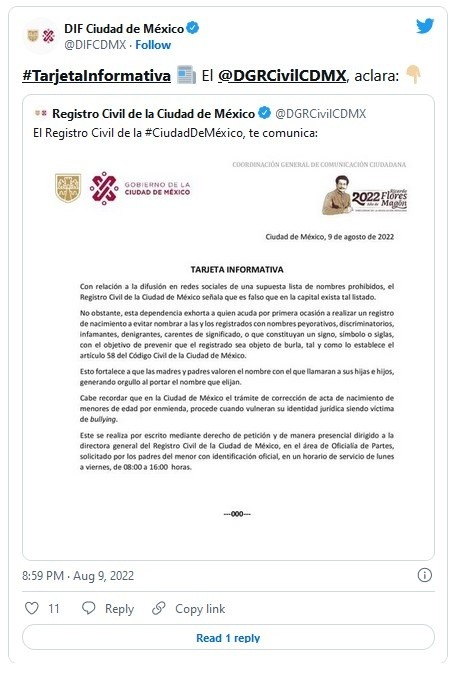 El DIF de la Ciudad de México informó que la lista que circuló este martes en redes sociales sobre los nombres prohibidos en México es falsa, debido a que no existe tal listado en la capital. En la supuesta lista aparecían nombres como Aceituno, Facebook, Batman, James Bond, Yahoo, Cesárea, entre otros; sin embargo, la dependencia desmintió la existencia de la misma, a pesar de que había sido compartida a través de sus redes sociales."Con relación a la difusión en redes sociales de una supuesta lista de nombres prohibidos, el Registro Civil de la Ciudad de México señala que es falso que en la capital exista tal listado", anunció el DIF mediante una tarjeta informativa.No obstante, exhortó a que cuando se acuda a registrar un nacimiento evite nombres "peyorativos, discriminatorios, infamantes, denigrantes, carentes de significado, o que constituyan un signo, un símbolo o siglas, con el objetivo de prevenir que el registrado sea objeto de burla".También recordó que en la Ciudad de México el trámite para corregir el nombre de menores de edad se lleva a cabo cuando vulneran su identidad jurídica siendo víctimas de bullying.JM
