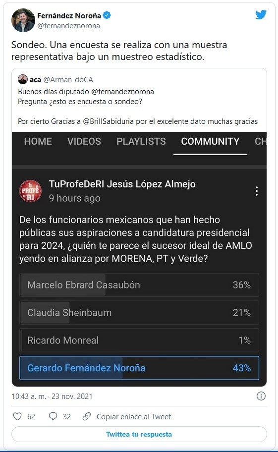 Gerardo Fernández Noroña, diputado del Partido del Trabajo (PT), compartió en su cuenta de Twitter un sondeo que lo posiciona como “el sucesor ideal” del Presidente Andrés Manuel López Obrador (AMLO), post que ha desatado toda clase de reacciones en redes sociales.El legislador petista decidió retuitear una imagen del sondeo que realiza en su canal de YouTube Jesús López Almejo, profesor de Relaciones Internacionales e investigador del Consejo Nacional de Ciencia y Tecnología (Conacyt).El sondeo cuestiona al público qué funcionario mexicano que ya ha hecho públicas sus aspiraciones por la candidatura presidencial del 2024 por la alianza Morena, PVEM y PT es el sucesor ideal de AMLO.Por encima de funcionarios como Marcelo Ebrard, secretario de Relaciones Exteriores; Claudia Sheinbaum, jefa de Gobierno de la Ciudad de México y Ricardo Monreal, coordinador de la bancada de Morena en el Senado, está Fernández Noroña con un 43% de las preferencias, de acuerdo con los resultados compartidos por el usuario @Arman_doCa, los cuales fueron retuiteados por Noroña.“Sondeo. Una encuesta se realiza con una muestra representativa bajo un muestreo estadístico”, escribió Fernández Noroña para aclarar el cuestionamiento del usuario sobre si se trataba de un sondeo o una encuesta, pero no se posicionó sobre que los resultados lo favorecen.Hace un mes, Gerardo Fernández Noroña pidió a sus homólogos que no lo subestimen como “presidenciable” para el año 2024.“Entonces, vienen a atacar aquí a muy valiosos compañeros, el canciller Marcelo Ebrard, que ha hecho un trabajo espléndido, brillante, verdaderamente destacable, o a la compañera Claudia Sheinbaum, que ha hecho un trabajo extraordinario como jefa de gobierno en la capital del país”, dijo el diputado del PT en tribuna.Pero, cuando una legisladora gritó: “próxima presidenta”, refiriéndose a Sheinbaum, Fernández Noroña contestó de inmediato, “¿Quién sabe? No me subestimes, compañera. ¿Quién sabe?”, lo que dejó entrever sus verdaderas aspiraciones políticas.JM