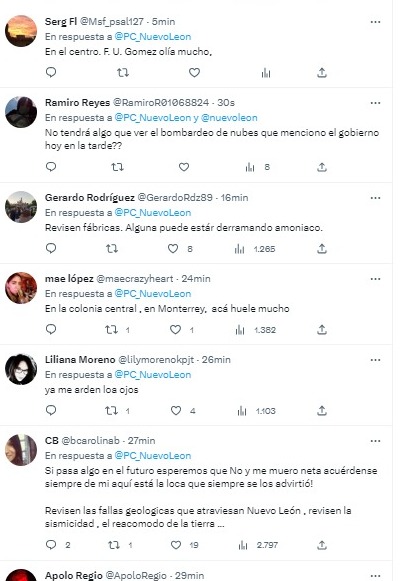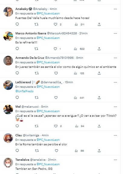 Vecinos de diferentes municipios de Nuevo León han reportado a las autoridades un fuerte olor a gas, por lo que Protección Civil de ese Estado informó que ya revisa qué es lo que ocurre."Se reciben múltiples reportes, en Juárez, Guadalupe, Santa Catarina, Cumbres. Los olores se perciben en otros municipios como García", señaló la dependencia.También en redes reportan que se percibe en Monterrey, San Nicolás, entre otros. Son cientos los comentarios de ciudadanos que mencionan que tienen la misma preocupación en sus viviendas.Los habitantes se encuentran alertados por el olor y ha dado aviso a elementos de Protección Civil de Nuevo León, quienes indicaron que tras recibir numerosas llamadas se empezó un recorrido por el municipio de Guadalupe para verificar la situación.La autoridad señala que aún no identifica qué está ocasionando el olor.La dependencia señaló que mantiene coordinación con unidades municipales de Protección Civil.Personal de comunicación de la refinería en Cadereyta, informa que sus operaciones se mantienen normales, se descartan en la planta y ductos, añadió Protección Civil estatal.