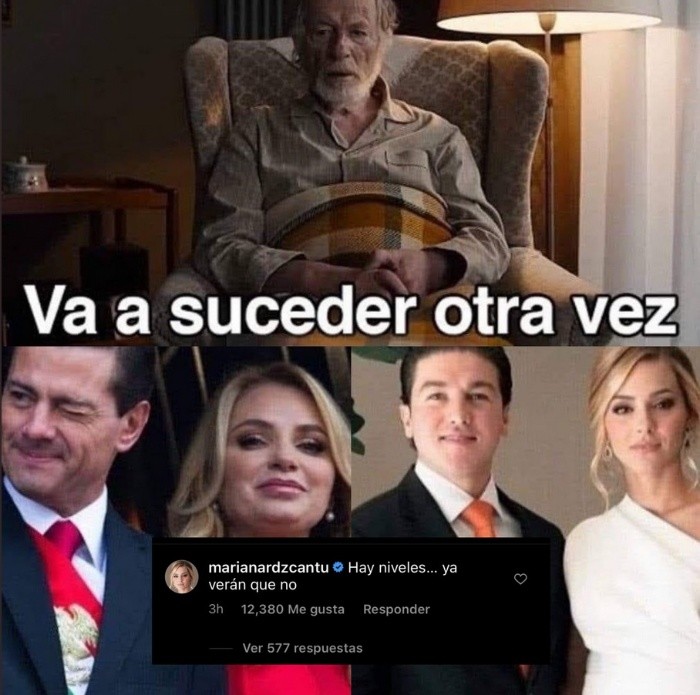 La esposa del gobernador de Nuevo León Samuel García e influencer, Mariana Rodríguez, rechazó la comparación que a través de memes se ha hecho sobre su matrimonio y el de la expareja presidencial de Enrique Peña Nieto y la actriz Angélica Rivera.Fue la cuenta de Instagram "memelasdeorizaba" quien compartió un meme en que se observa a la pareja de Samuel García y Mariana Rodríguez, junto a la de Enrique Peña Nieto y Angélica Rivera, mientras un personaje de la serie "Dark" de Netflix que ha vivido viajes en el tiempo asegura que "va a suceder otra vez". Esta publicación fue realizada el pasado viernes 15 de octubre y tiene, hasta el momento, más de 180 mil reacciones.El meme no pasó desapercibido y fue comentado por miles de usuarios, entre ellos, la misma Mariana Rodríguez quien escribió: "Hay niveles… ya verán que no".Inmediatamente su propia respuesta fue comentada y recibió críticas a favor y en contra de su postura. Logró obtener hasta ahora 765 comentarios.La pareja entre Samuel García y Mariana Rodríguez ha sido polémica desde antes de llegar al poder, en parte por los videos que compartían, más apegados a celebridades de la red que a una fórmula política, según algunos; hasta por declaraciones machistas polémicas de él, en alusión a su esposa.OA