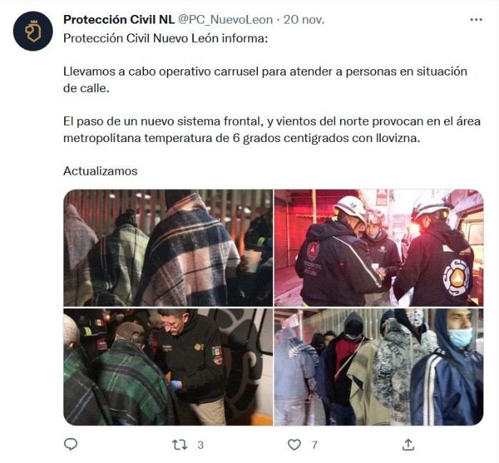 Protección Civil de Nuevo León informó que a través del Operativo Carrusel, que se ha puesto en práctica desde el miércoles hasta este lunes, se ha brindado atención a mil cien personas en situación vulnerable.En total, señaló Protección Civil, se han distribuido 820 litros de chocolate, mil 160 cobertores y mil 200 piezas de pan ante las bajas temperaturas que se han registrado en la Entidad, oscilando entre los seis y los once grados centígrados, aunque con sensación térmica inferior debido a la humedad prevaleciente.Las bebidas calientes, pan y cobertores se han repartido en las zonas cercanas a los hospitales, entre personas que permanecen al pendiente sobre la evolución de salud de sus familiares que están internados.Las brigadas se han concentrado en las inmediaciones del Hospital de Zona del Seguro Social, Hospital Universitario, Hospital Materno Infantil, Hospital Metropolitano y Hospital de Ginecología del IMSS.Asimismo, informó Protección Civil que se han realizado al menos 25 traslados a refugios temporales habilitados por el DIF estatal, que se mantienen al 50 por ciento de su capacidad, siendo estos los conocidos como El refugio, Posada Universitario, Posada Materno Infantil, Posada Metropolitano y Posada Linares.JM