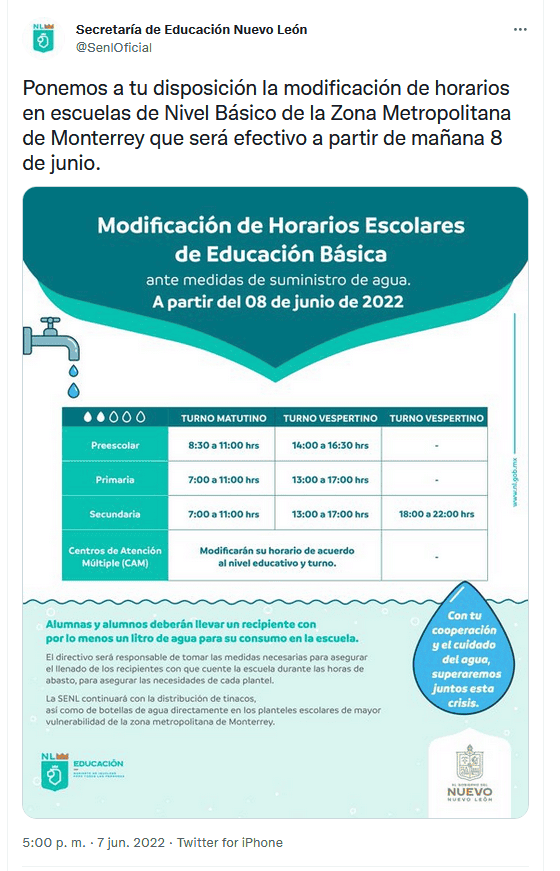 El programa Agua Para Todos contempla cortes de un día a la semana en forma alternada en siete sectores del área metropolitana de Monterrey, Nuevo León, por lo que el gobierno del estado también informó que se realizarán ajustes en los horarios escolares."Ante los protocolos anunciados por Servicios de Agua y Drenaje de Monterrey, sobre la restricción del suministro de agua de las 04:00 a las 10:00 horas, y buscando el bienestar de la comunidad educativa, la Secretaría de Educación de Nuevo León da a conocer las siguientes medidas para las escuelas de educación básica" señaló la dependencia estatal en un comunicado.Detalló que los horarios de la jornada escolar a partir del ocho de junio serán en Preescolar de 08:30 a 11:00 horas para turno matutino y de 14:00 a 16:30 horas para turno vespertino; en Primaria de 07:00 a 11:00 horas para turno matutino y de 13:00 a 17:00 horas para turno vespertino.Asimismo en los Centros de Atención Múltiple (CAM) se modificarán su horario de acuerdo al nivel educativo y turno; en Secundaria el horario será de 07:00 a 11:00 horas para turno matutino; en turno vespertino de 13:00 a 17:00 horas y de 18:00 a 22:00 horas para turno nocturno.Además, se solicita a los alumnos llevar un recipiente con por lo menos un litro de agua para su consumo en la escuela, al tiempo que se instruyó a los directores de todos los turnos a tomar las medidas necesarias para asegurar el llenado de los recipientes con que cuente la escuela durante las horas de abasto, para asegurar las necesidades de cada plantel.Se precisó que "los recipientes serán compartidos en todos los turnos, asegurando que cuenten con la reserva correspondiente de agua".Señaló la SE que continuará con la distribución de tinacos, y de botellas de agua directamente en los planteles escolares de mayor vulnerabilidad de la zona metropolitana, al tiempo de precisar que en Educación Media Superior y Superior, así como en Instituciones Públicas Formadoras de Docentes se continuará con los horarios habituales.Citó la SE que en apoyo a las escuelas afectadas por la reducción del suministro, se continúa con la entrega de tinacos en zonas vulnerables y con mayor alumnado, en los municipios de Apodaca, Ciénega de Flores, El Carmen, García, Escobedo, Guadalupe, Juárez, Monterrey, Pesquería, Salinas Victoria, San Nicolás de los Garza, San Pedro Garza García y Santa Catarina, donde se han beneficiado 291 mil 620 alumnas y alumnos con mil 387 tinacos en mil 163 planteles.Además, mediante la donación de agua embotellada, se han entregado al día de hoy 244 mil 100 botellas de agua en 95 escuelas, beneficiando a 41 mil 293 alumnas y alumnos.OF