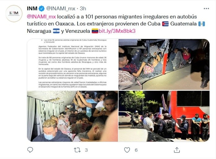 Un total de 101 migrantes, entre ellos nueve menores no acompañados, que viajaban en un autobús turístico que transitaba por la ciudad de Oaxaca, fueron detenidos por agentes, informó este jueves el Instituto Nacional de Migración (INM).En un comunicado, el INM precisó que los nueve menores son de nacionalidad cubana, mientras que las otras 92 personas adultas son originarias de Cuba, Guatemala, Nicaragua y Venezuela.De la cifra total, las autoridades indicaron que 80 personas proceden de Cuba (nueve menores, 26 mujeres y 45 hombres adultos), 18 de Guatemala (15 hombres y tres mujeres), así como dos hombres adultos de Nicaragua, y otro más de Venezuela.Según el comunicado, los agentes del INM se percataron que un autobús turístico estaba estacionado "por una aparente falla mecánica".Luego, al realizar una revisión del vehículo, hallaron a los extranjeros. "Algunas personas viajaban en la parte baja del vehículo donde se resguardan las maletas", quienes no pudieron acreditar su estancia regular en el país.Las autoridades indicaron que los extranjeros mayores de edad fueron trasladados a oficinas migratorias, en tanto los infantes quedaron bajo tutela del Sistema para el Desarrollo Integral de la Familia (DIF) en el estado.En tanto, el conductor, dos de sus acompañantes y la unidad de transporte fueron puestos a disposición del Ministerio Público (MP), para los efectos legales correspondientes.JM