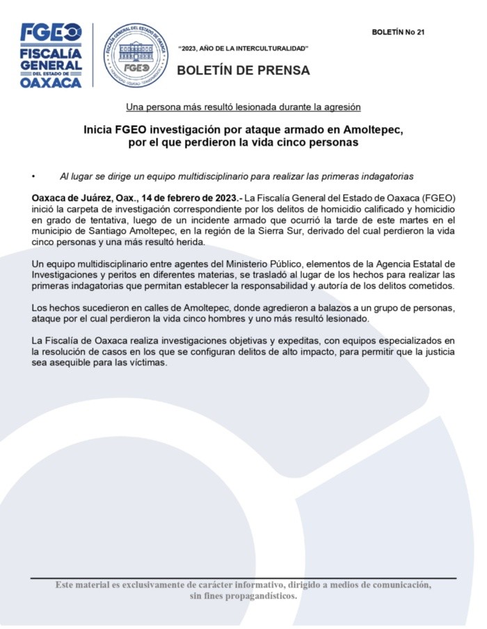 Cinco personas fueron asesinadas frente al Palacio Municipal de Santiago Amoltepec, comunidad de la Sierra Sur de Oaxaca, en un enfrentamiento armado donde participaron hombres que portaban rifles de alto poder.En dos fotografías que circularon en redes sociales se observan los cuerpos de las cinco personas, quienes yacen abatidos en la explanada municipal, junto a una camioneta de doble cabina con vidrios oscuros e impactos de balas. Las víctimas aparecen con armas largas a un costado.También se ve a los habitantes del poblado observando a la distancia los cuerpos de los hombres abatidos. La información fue dada a conocer poco antes de las 4 de la tarde de este martes y minutos después el gobernador de Oaxaca, Salomón Jara Cruz (Morena) confirmó los hechos de violencia y ordenó un operativo en la zona.A través de Twitter, Jara Cruz lamentó la violencia ocurrida en este municipio y dio a conocer que también solicitó a la Fiscalía General del Estado de Oaxaca (FGEO) que inicie la investigación correspondiente; mientras que ordenó a la Secretaría de Seguridad y Protección Ciudadana "implementar un operativo de protección y vigilancia para resguardar el orden y la paz en ese municipio de la Sierra Sur".La fiscalía informó que de forma preliminar el saldo es de cinco personas sin vida y una más herida por disparos de arma de fuego.También señaló que los hechos fueron notificados a las 15:20 horas de este día por parte del Síndico de Santiago Amoltepec, que pertenece al distrito de Sola de Vega, Oaxaca.Las autoridades de seguridad no han informado sobre el saldo oficial de víctimas ni las circunstancias en las que se dio este enfrentamiento en el Palacio Municipal de Santiago Amoltepec.