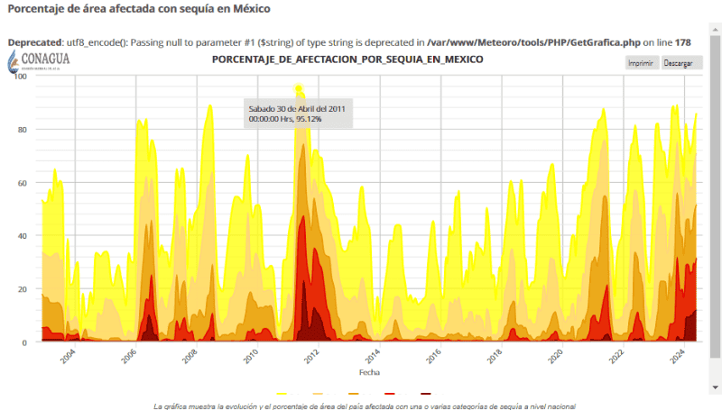 México es afectado por la tercera ola de calor de la temporada 2024, y aunado a eso, más del 85% del territorio mexicano atraviesa por una sequía de anormalmente seca a excepcional. De acuerdo con el corte al 15 de mayo, el Monitor de Sequía de la Comisión Nacional del agua (Conagua), el 85.58% del territorio presenta algún tipo de escasez debido a la falta de lluvias y escurrimientos. El reporte hasta esa fecha indica que 14.82 por ciento del territorio nacional se encuentra anormalmente seco (D0), 19.48 por ciento tiene sequía moderada (D1), 20.10 por ciento con sequía severa (D2), 19.36 por ciento con sequía extrema (D3) y 11.82 por ciento con sequía excepcional (D4). Jalisco presenta niveles extremos y moderados.Aunque pareciera que la escasez de agua este año es la peor que se ha registrado, según el Monitor de sequía, fue el año 2011 cuando México vivió los niveles más altos. La gráfica que aparece en la página de la Conagua indica que el 30 de abril de ese año se tuvo un nivel de 95.12% del territorio mexicano afectado por estas condiciones.En aquel año, México era afectado por el fenómeno "La Niña", que provoca enfriamiento de las aguas del océano Pacífico. Este año, el fenómeno "El Niño" está llegando a su fin para dar paso al otro durante el verano. Se prevé que aumenten las lluvias para ese periodo, lo que podría ayudar a contrarrestar las condiciones climáticas actuales.*Mantente al día con las noticias, únete a nuestro canal de WhatsAppOF