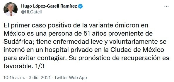 La Secretaría de Salud de México confirmó este viernes el primer caso detectado de la variante ómicron de coronavirus en el país, tras el análisis de una muestra por parte del Instituto de Diagnóstico y Referencia Epidemiológicos (Indre).A nivel mundial, ómicron fue identificada por primera vez en Sudáfrica. Autoridades de ese país alertaron el pasado 25 de noviembre sobre la nueva variante, caracterizada por múltiples mutaciones. Desde entonces se han reportado casos de ómicron en unos 30 países alrededor del mundo, incluido Estados Unidos.México es, después de Brasil, el segundo país de América Latina en detectar la nueva variante.Tanto Hugo López-Gatell, subsecretario de Salud federal y estratega del Gobierno mexicano contra la pandemia de COVID-19, como la Secretaría de Salud dieron detalles sobre el caso.La persona contagiada es un hombre de 51 años, de origen sudafricano, que se dedica a actividades empresariales.Llegó a México el 21 de noviembre y, seis días después, presentó sintomatología característica de COVID-19 leve. El 29 de noviembre, el enfermo recibió atención en un hospital privado de la zona metropolitana de la Ciudad de México. Durante su evaluación en urgencias se encontraba estable, con saturación de oxígeno del 95%. Se encuentra en aislamiento preventivo voluntario y su pronóstico de recuperación es favorable.El paciente ya contaba con el esquema completo de vacunación del laboratorio Pfizer.Al paciente se le realizó la prueba de antígeno y RT-PCR, que resultaron positivo a COVID-19.El 30 de noviembre se recibió la muestra en el Indre, donde inició su análisis con el nuevo protocolo establecido el 26 de noviembre.Autoridades de Salud dijeron que el país actualizó los protocolos de vigilancia genómica para efectuar la búsqueda intencionada de la variante, desde que el 26 de noviembre la Organización Mundial de la Salud (OMS) la calificó como “variante de preocupación”."Cómo ocurrió con otras mutaciones del virus causante de COVID-19, gracias a la colaboración de la Red Nacional de Laboratorios de Salud Pública de México (RNLSP), se tuvo eacceso a muestras para la vigilancia genómica en todol país, lo que derivó en el hallazgo de ómicron", explicó la Secretaría de Salud.El Indre dio a conocer que los resultados preliminares son positivos para el gen N2, y la muestra presenta falla en la diana del Gen S: negativo a gen S, positivo al gen ORFab y positivo al gen N), características de la variante ómicron.López-Gatell aseguró este viernes que la llegada de ómicron al país no supone "un motivo de preocupación" mayor porque no es una variante "más agresiva" que las demás.Dijo que "las recomendaciones siguen siendo las mismas" que otras variantes del COVID-19, es decir, distanciamiento social, uso de cubrebocas, lavado de manos y, sobre todo, vacunarse."El llamado concreto es vacunarse, pero no por ómicron, sino por cualquier variante que exista de este virus", indicó.Con información de AFP y EFEIM