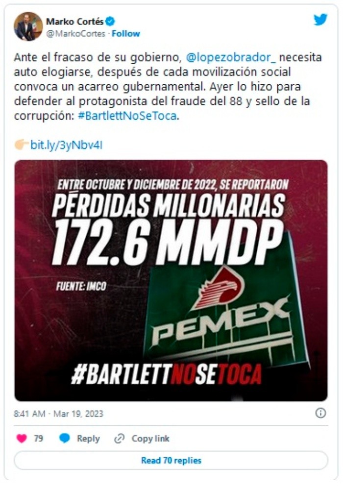 La "marcha de acarreados" que se realizó en el Zócalo no fue para defender la soberanía nacional, sino para defender la opacidad, las irregularidades, los conflictos de interés, para excusar el robo y los fraudes electorales y para tapar la corrupción característica de este gobierno encarnada en un solo hombre: Manuel Bartlett, aseguró el presidente del PAN, Marko Cortés Mendoza."Vergüenza debería darle a López Obrador cobijar en una de las empresas más importantes del Estado mexicano al principal protagonista del fraude electoral de 1988", advirtió en un comunicado.Recordó que Bartlett fue el responsable del fraude electoral y caída del sistema en el conteo de los votos de la elección presidencial de 1988, que impidió el triunfo de la oposición y que en su momento fue denunciado conjuntamente por Manuel Clouthier, Cuauhtémoc Cárdenas y Rosario Ibarra de Piedra.En 1985 fue acusado de ser presuntamente cómplice en el homicidio del agente de la DEA Enrique "Kiki" Camarena y protector de delincuentes como Rafael Caro Quintero, Miguel Ángel Félix Gallardo y Ernesto Fonseca Carrillo.Recordó que, ya como funcionario morenista, Barlett fue señalado por ocultar en su declaración patrimonial la existencia de 12 empresas, algunas relacionadas con el sector eléctrico, registradas a nombre de sus familiares.Marko Cortés señaló que, por si fuera poco, entre octubre y diciembre de 2022, la Comisión Federal de Electricidad (CFE) reportó pérdidas por 172.6 mil millones de pesos, lo que equivale a 0.9 veces el presupuesto ejercido en ese mismo año por la Secretaría de Salud."Qué le sabrá Bartlett al Presidente o qué le debe el Presidente a Bartlett, para que pese a todos estos testimonios, lo haya incluido en su gobierno y lo esté defendiendo a capa y espada permitiéndole que goce del manto protector de un cargo público y pueda seguir aumentando su riqueza de manera inexplicable. Está claro que con el gobierno morenista, Bartlett no se toca", agregó.Sostuvo que, ante el rotundo fracaso de su gobierno, fue muy evidente que el Presidente necesita autoelogiarse, porque después de cada movilización social se realiza un acarreo gubernamental.El dirigente nacional del PAN lamentó que nuevamente se hayan utilizado a las clientelas dependientes de los programas sociales para alimentar el ego presidencial y defender el pésimo trabajo de personajes como Bartlett."El gobierno y su partido han caído ya literalmente en el delirio y se han colocado completamente fuera de la realidad, nada puede ser más falso que la supuesta soberanía energética", señaló.Para muestra, afirmó que hoy los mexicanos somos más dependientes energéticamente respecto del 2018, "y este gobierno ha despilfarrado cientos de miles de millones de pesos con el pretexto de conseguirla"."Es un delirio festejar una supuesta soberanía cuando siete de cada 10 litros de gasolina que se consumen en México son de importación, cuando el 90 por ciento del gas que se consume en nuestro país, es de importación", manifestó.JM