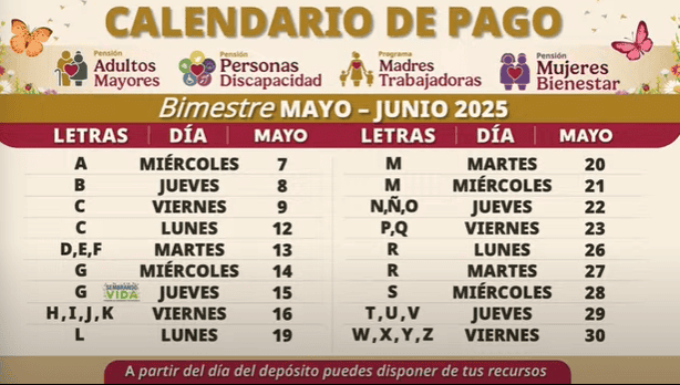 El Gobierno de México, mediante la Secretaría del Bienestar, entrega apoyos a los sectores más vulnerables de la población. El monto depende del programa, además de la cantidad de miembros que pueden formar parte del mismo dentro de una familia.Entre estos programas destaca la Pensión Bienestar para adultos mayores, en las que los beneficiarios reciben el pago de su dinero a través de tarjeta bancaria. Para mayo de 2025, mes en el que se debería depositar el dinero también del mes de junio (los pagos se realizan cada bimestre), los inscritos recibirán un pago de 6 mil 200 pesos.Las personas deben saber que todo pago de la Pensión Bienestar para adultos mayores se debe retirar después de que les deposite, según la fecha del calendario oficial, ya sea en el Banco del Bienestar, cajeros de otros bancos, o en tiendas de supermercado al realizar la compra de un producto en caja. Fue hasta hoy 6 de mayo que se difundió el calendario de pagos correspondientes al quinto mes del año, el cual normalmente se da según la fecha y la letra inicial del primer apellido. Es importante aclarar que los depósitos de este periodo no fueron suspendidos, ya que no se habían revelado fechas oficiales.La Pensión Bienestar es un apoyo universal que se entrega a todas las mujeres y hombres mayores de 65 años en México. El programa señala que este tiene por objetivo contribuir al bienestar de las personas adultas mayores a través de la entrega de una pensión no contributiva que ayude a mejorar sus condiciones de vida y que a su vez permita el acceso a la protección social.También a partir de este año, a las mujeres que cumplen 63 años, pueden registrarse a la Pensión Mujeres Bienestar. Ellas reciben un apoyo de 3 mil pesos bimestrales.*Mantente al día con las noticias, únete a nuestro canal de WhatsAppOF