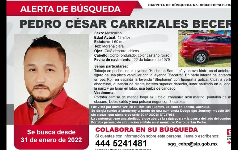Pedro César Carrizales, "El Mijis", fue reportado como desaparecido, informó la Comisión Estatal de Búsqueda de Personas San Luis Potosí. El ex diputado local de San Luis Potosí fue visto por última vez el 31 de enero en el Hotel las Fuentes, ubicado en Santillo, Coahuila, según la ficha de búsqueda.Se dirigía rumbo a Monterrey a bordo de una camioneta modelo 2014 color rojo sin placas. Pedro César Carrizales portaba una camisa de manga larga azul cielo, chamarra azul marino, pantalón de mezclilla azul obscuro, botas cafés y una pulsera negra con tres cuarzos. El pasado 31 de octubre de 2021, "El Mijis" ya había sido reportado como desaparecido. Ese día asistió a una protesta pacífica y sus familiares denunciaron que habían perdido comunicación con él y no se sabía nada de su paradero. En aquella ocasión fue localizado luego de 12 horas.Dijo que en esa ocasión fue torturado para luego ser liberado sobre la carretera cerca de la comunidad Cerro Gordo, perteneciente al municipio de Villa de Zaragoza, en San Luis Potosí.