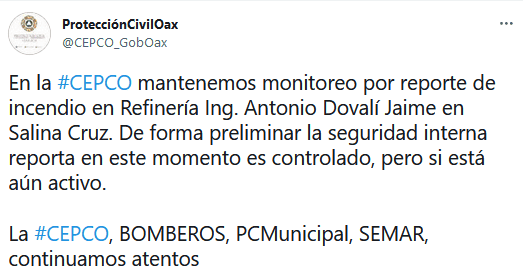 Un incendio consumió parte de las instalaciones de la refinería Antonio Dovalí Jaime, en Salina Cruz, región Istmo de Tehuantepec; no obstante, las autoridades no reportaron muertos o heridos hasta el momento, sólo daños materiales.La Coordinación Estatal de Protección Civil (CEPCO) informó en su cuenta de Twitter que tenía el incendio controlado, hasta la mañana del sábado, aunque aún seguía activo."En la #CEPCO mantenemos monitoreo por reporte de incendio en Refinería Ing. Antonio Dovalí Jaime en Salina Cruz. De forma preliminar la seguridad interna reporta en este momento es controlado, pero si está aún activo".Además, dijo que el cuerpo de Bomberos, Protección Civil de Salina Cruz, así como la Secretaría de Marina, continuaban atentos al monitoreo de la zona.De acuerdo con la agencia de noticias Quadratín, Petróleos Mexicanos (Pemex) controló el incendio de forma interna, mismo que habría iniciado en la planta número 2 por una falla técnica.Hasta el momento, Pemex no se ha declarado públicamente sobre el incendio.Vecinos de la zona compartieron videos y fotos durante la madrugada del sábado, en los que se aprecia la magnitud del incendio, visible en una gran llamarada que podía ver a la distancia.GC
