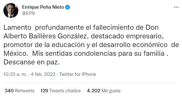 Después de un largo tiempo sin postear en sus redes sociales, el expresidente de México, Enrique Peña Nieto reapareció para lamentar la muerte del empresario Alberto Baillères.Fue a través de su cuenta de Twitter que Peña Nieto destacó que Alberto Baillères González "fue un destacado empresario, promotor de la educación y el desarrollo económico"."Lamento profundamente el fallecimiento de Don Alberto Baillères González (...) Mis sentidas condolencias para su familia . Descanse en paz", escribió Peña Nieto.La última interacción de Enrique Peña Nieto en redes sociales fue en julio de 2021, también para enviar condolencias por la muerte de René Juárez Cisneros, un hecho que aprovecharon algunos usuarios para ironizar sobre que el expresidente sólo aparecía cuando alguien moría. El empresario mexicano Alberto Baillères González, quien fuera presidente de Grupo Bal, falleció el pasado miércoles, según informan fuentes de la misma empresa este jueves.Alejandro Baillères, presidente de BAL, publicó una misiva para directores corporativos donde confirma el deceso: "Con profunda tristeza se informa al público inversionista la irreparable pérdida de Don Alberto Baillères (...) el Consejo extiende sus más profundas condolencias a la familia Baillères y le gustaría agradecer a Don Alberto su intachable ejemplo y extraordinario legado, el cual vivirá por siempre".Fundador del Instituto Tecnológico Autónomo de México (ITAM), dueño del mencionado Grupo BAL y considerado el cuarto hombre más rico de México, falleció a los 90 años.Bailléres, quien se retiró apenas de la actividad empresarial en abril de 2021, lideró un conglomerado de negocios donde se incluyen firmas importantes como Industrias Peñoles, Fresnillo plc, El Palacio de Hierro, TANE, Grupo Nacional Provincial, Profuturo, Valmex Casa de Bolsa, Grupo de Agro-negocios BAL y de reciente creación, PetroBal, Energía Eléctrica Bal y EnerAB.Baillères también formó parte del consejo de administración de compañías como Grupo Financiero BBVA-Bancomer, Fomento Económico Mexicano, Desc Sociedad de Fomento Industrial, Grupo Televisa y J.P. Morgan International Council.A la par, desde 1967 fue miembro del Consejo Mexicano de Negocios, además de ser miembro fundador de la Fundación para las Letras Mexicanas, A.C. de la Fundación UNAM, A.C., de la Fundación de Estudios Financieros, A.C., y de la Fundación Alberto Baillères.En 2015, el Senado de la República le concedió la máxima distinción que concede el Estado Mexicano a un ciudadano, la Medalla Belisario Domínguez.GC
