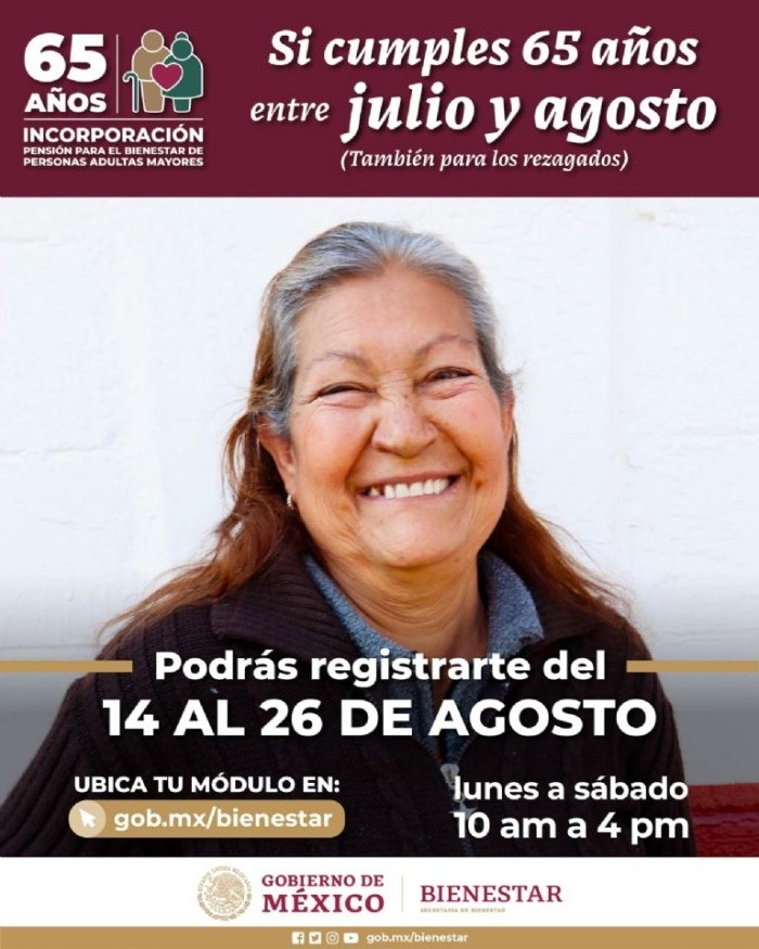 La Pensión del Bienestar es uno de los principales apoyos económicos que brinda el Gobierno Federal a los adultos mayores de 65 años.La Secretaría del Bienestar ha alertado a las personas de la tercera edad que quieran recibir, de forma bimestral, una pensión de 4 mil 800 pesos, ya que los días para registrar a las nuevas incorporaciones están por terminar. Ariadna Montiel Reyes, titular de la dependencia, se dirigió a los 11.5 millones de cuentahabientes de este apoyo gubernamental a través de su programa Bienestar Responde, que se transmite por Facebook Live cada miércoles, para transmitir un importante mensaje, sobre la fecha límite para solicitar la pensión del programa de Bienestar. La titular de Bienestar, mencionó que aquellos mexicanos mayores de 65 años que les interese recibir la pensión, el día de hoy 26 de agosto es el último día para registrarse. En conclusión, las personas que ya hayan cumplido 65 años o más en los meses de julio y agosto de este año, ya pueden registrarse en el programa de Bienestar. AH