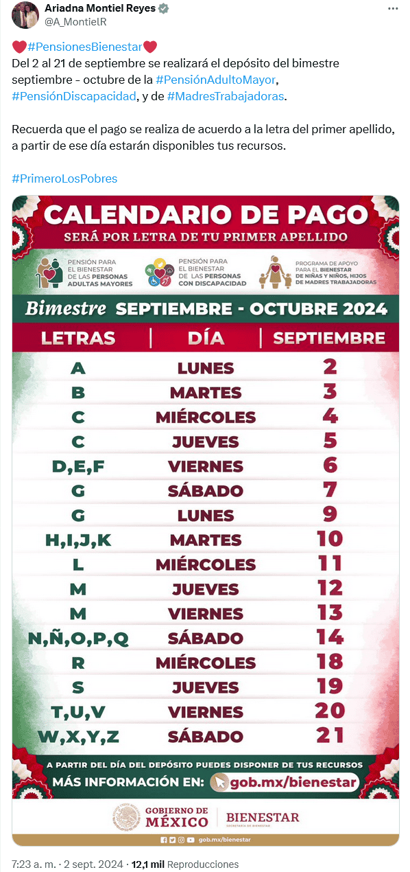 Este lunes 2 de septiembre, la secretaria del Bienestar, Ariadna Montiel Reyes dio a conocer el calendario de pagos para la Pensión de personas adultas mayores, con discapacidad, así como para el Bienestar de niñas y niños hijos de madres trabajadoras, correspondiente al bimestre septiembre-octubre de 2024.La titular de Bienestar publicó en sus redes sociales las fechas en que se depositarán los apoyos económicos de cada beneficiario para apoyar a las familias mexicanas, que inician de manera formal con el nuevo mes este lunes 2 y concluirán el próximo sábado 21 de septiembre.Es importante recordar que las personas adultas mayores reciben 6 mil pesos; las personas con discapacidad, 3 mil 100 pesos; y los hijos de madres trabajadoras, mil 600 pesos.El calendario de la Pensión Bienestar indica que este lunes 2 de septiembre inicia el pago de acuerdo con la primera letra de su apellido.Los pagos se realizan de manera directa y sin intermediarios a través de la tarjeta del Banco del Bienestar, por lo que el pago se encuentra garantizado y no es necesario acudir a las sucursales antes de la fecha programada.La Pensión Bienestar es un programa social del Gobierno de México destinado a brindar un apoyo económico bimestral a las personas adultas mayores de 65 años en adelante, personas con discapacidad y madres trabajadoras.El objetivo principal de este programa es mejorar la calidad de vida de los beneficiarios.*Con información de SUN*Mantente al día con las noticias, únete a nuestro canal de WhatsAppOF