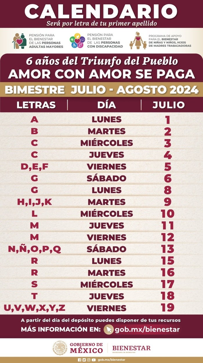 La Pensión Bienestar, uno de los programas sociales más importantes del Gobierno de México, ha regresado después de la pausa que implicó la veda electoral por las elecciones del pasado 2 de junio.La Pensión Bienestar consiste en un apoyo económico bimestral de 6 mil pesos para ayudar en la economía de los adultos mayores de México, sin otra condición más que sean mayores a 65 años.Ariadna Montiel Reyes, secretaria del Bienestar, compartió en sus redes sociales el calendario oficial de pago para el bimestre julio-agosto. Los 6 mil pesos se depositarán en días específicos en la tarjeta del Bienestar de los beneficiarios, de acuerdo a la primera letra del apellido del adulto mayor.De acuerdo con el calendario oficial de pago, los adultos mayores que este miércoles reciben 6 mil pesos son aquellos cuya primera letra del apellido inicia con la "C". Es necesario contar con la tarjeta del Banco del Bienestar para poder cobrar el depósito, pues ya no se otorga en dinero en efectivo. Si aún no cuentas con tu tarjeta, es importante acudir a un módulo de rezagados con la siguiente documentación: Para los adultos mayores a los que no les sea posible acudir un módulo, pueden agendar una visita domiciliaria en el número 800 639 42 64. FS