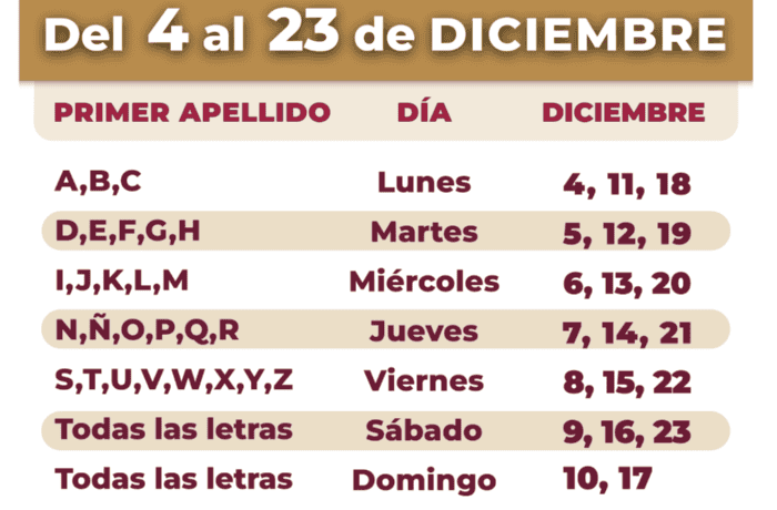 Cualquier adulto mayor a 65 años puede ser acreedor al apoyo económico de la Pensión Bienestar otorgada por el Gobierno de México. Actualmente, se encuentra una convocatoria abierta para los adultos mayores que cumplan 65 años del 1 de noviembre del 2023 al 30 de junio del 2024. La convocatoria actual estará vigente del 4 al 23 de diciembre, en los módulos del Bienestar disponibles en todos los estados del país. La ubicación de los módulos oficiales puede consultarse en la página oficial del Gobierno de México. Es necesario que el adulto mayor se presente con la documentación debida en un horario de 10 am a 4 pm, de lunes a domingo, y tan solo del 4 al 23 de diciembre del año en curso. El registro se realiza según el primer apellido, por lo que hay días específicos que puedes consultar en la siguiente imagen. Para el jueves 7 de diciembre, corresponde a las personas cuyo apellido inicia con las letras N, Ñ, O, P, Q y R. La persona solicitante adulta mayor debe llevar consigo los siguientes documentos para poder incorporarse al programa:En caso de que el adulto mayor necesite ayuda durante el trámite, es posible llevar consigo a algún familiar o un "auxiliar", que deberá llevar los mismos documentos de identificación. FS