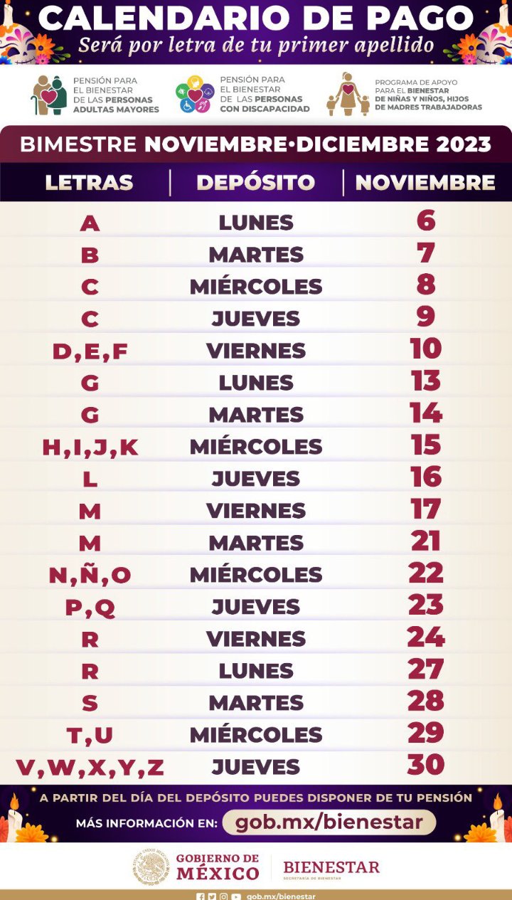 La Pensión Bienestar es uno de los programas sociales más queridos, pues los adultos mayores de 65 años y más reciben bimestralmente 4 mil ochocientos pesos. Este subsidio les permite pagar algunos servicios, ahorrar dinero, o comprar víveres, entre otras opciones. Por ello, quienes se han registrado exitosamente se preguntan cuándo caerá el próximo pago y cómo cobrarlo.La Secretaría del Bienestar comunicó a través de su directora, Ariadna Montiel Reyes, que los adultos mayores podían recoger sus tarjetas para cobrar la pensión correspondiente al mes de noviembre 2023.El calendario de pagos de la Pensión Bienestar sigue su curso regular y los beneficiarios verán reflejados el pago en su tarjeta del bienestar según la letra de su apellido. Las fechas oficiales ya han sido publicadas por la dependencia. Como siempre, estas fechas corresponden a días hábiles para la ejecución de los pagos, lo que garantiza que los beneficiarios tengan acceso a sus fondos de manera oportuna.Para cobrar la Pensión del Bienestar, el adulto mayor o su persona auxiliar puede ir a cualquier sucursal del Banco del Bienestar y retirar el dinero en el cajero automático, o en ventanilla.Cabe señalar, que la tarjeta del bienestar también puede usarse en otros cajeros automáticos ajenos al Banco del Bienestar; sin embargo, hay algunos que cobran comisión, mientras que en Banco Azteca, Banorte y Banjército.Además puedes realizar retiros en Walmart, Soriana, La Comer, Bodega Aurrera, Chedraui, Suburbia y Office Depot.Mantente al tanto de las noticias y únete a nuestro canal de Whatsapp.MM