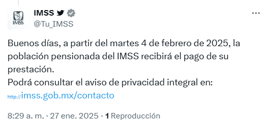 Ya inició febrero, y los beneficiarios de la Pensión del IMSS quieren conocer cuándo es el pago de la prestación correspondiente al nuevo mes. Sobre eso, en su página oficial el instituto ya dio a conocer el calendario de 2025.En días pasados, en redes sociales, a pregunta de un usuario, el IMSS señaló que el pago de la pensión de febrero de 2025 será hasta el martes 4 del mismo mes. En esta ocasión, el día 1 cae en sábado, que es día inhábil, y lo mismo ocurre con el domingo 2; para el día 3 es un nuevo día no laborable, ya que, según la Ley Federal del Trabajo (LFT) corresponde a un puente con motivo de la conmemoración de la promulgación de la Constitución Mexicana que se celebra el día 5. Entonces, el primer día hábil del mes es justamente el martes 4, que coincide con la respuesta en redes sociales.Luego, en su portal oficial, el IMSS ya publicó el calendario oficial de los pagos de la pensión de este año, lo que respalda la información anterior.La Pensión del IMSS es una "prestación económica destinada a proteger al trabajador al ocurrirle un accidente de trabajo, al padecer una enfermedad o accidente no laborales, o al cumplir al menos 60 años de edad", indica el portal oficial.El IMSS señala que las pensiones se dividen en 3 grupos, los cuales son:Estas son las personas que deben conocer entonces que el pago de febrero será hasta el día martes 4.Lo mejor es siempre estar atento a los canales oficiales para que conozcas la información ante cualquier cambio o ajuste en el calendario.*Mantente al día con las noticias, únete a nuestro canal de WhatsAppOF