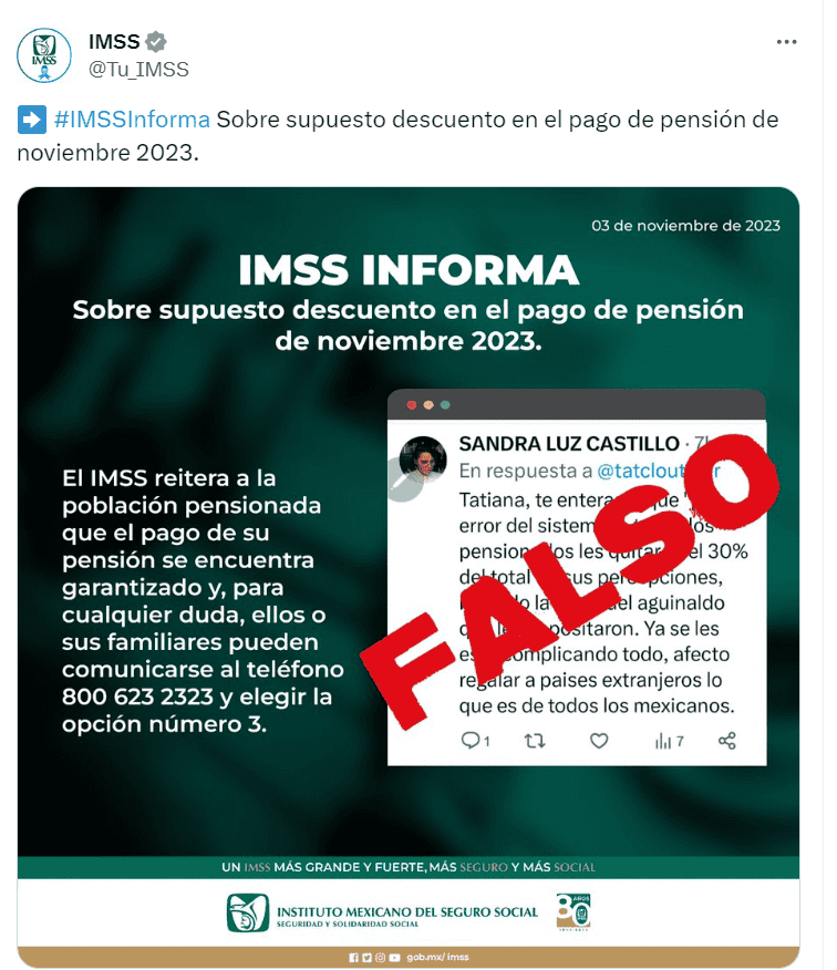 A través de redes sociales se ha estado difundiendo información en la que aseguran el aguinaldo del IMSS no llegará completo, pues presuntamente el gobierno mexicano estaría pensando en reducir el pago del mes de noviembre, así como el aguinaldo de la Pensión IMSS en un 30%, esto como una forma de "ahorrar fondos".Lo anterior ha generado preocupación entre los jubilados pensionados de la población mexicana afiliados al Instituto Mexicano del Seguro Social, ante este rumor, la propia institución se ha pronunciado al respecto y a continuación te daremos los detalles sobre la posible reducción.A través de la red social X (anteriormente Twitter) el Instituto Mexicano el Seguro Social decidió emitir un comunicado en vista de la desinformación que había comenzado a circular, esto con el objetivo de desmentir lo que se está diciendo en dicha red social:"El IMSS reitera a la población pensionada que el pago de su pensión se encuentra garantizado, y para cualquier duda, ellos o sus familiares pueden comunicarse al teléfono 800 623 2323 y elegir la opción #3″, se lee en la imagen que compartieron, donde también anexaron la publicación de un usuario de X quien ha dicho que la reducción es real.Con dicho mensaje, el IMSS busca que todos los jubilados y pensionados mantengan la calma, ya que van a recibir el pago de aguinaldo completo, mismo que corresponde a una quincena, es decir, recibirán su mensualidad completa más un 50% adicional.Es importante recordar que el aguinaldo es parte de las prestaciones mínimas establecidas por la ley, obligación que deben cumplir las empresas y los empleadores, de acuerdo con lo estipulado en el artículo 87 de la Ley Federal del Trabajo: "Los trabajadores tendrán derecho a un aguinaldo anual que deberá pagarse antes del día veinte de diciembre, equivalente a treinta días de salario, por lo menos".YCSigue al día con las noticias, únete a nuestro canal de WhatsApp