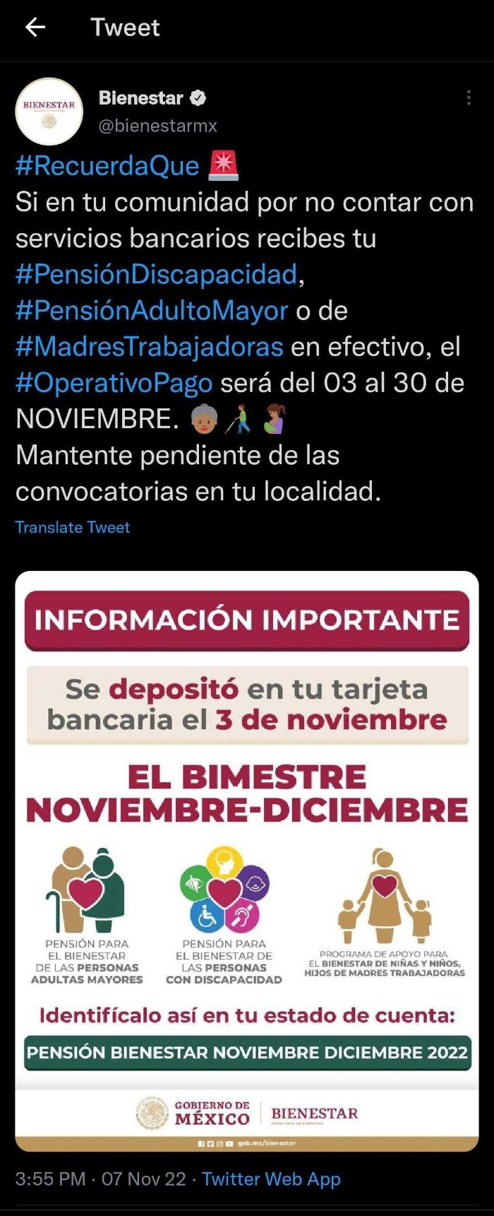 Ariadna Montiel, titular del programa de pensiones "Bienestar" anunció que desde el pasado 3 de noviembre se comenzó con el depósito de la pensión que comprende el periodo de noviembre-diciembre, sin embargo la fecha límite de pago es el 30 de este mes.Los pagos comprenden a todo beneficiado de los programas:A través de la cuenta oficial del programa en Twitter, se anunció otra opción para quienes no cuentan con servicios bancarios en su comunidad, y que de esta manera puedan pasar a recoger el monto en efectivo. Sin embargo las convocatorias por localidades todavia no son publicadas. BB