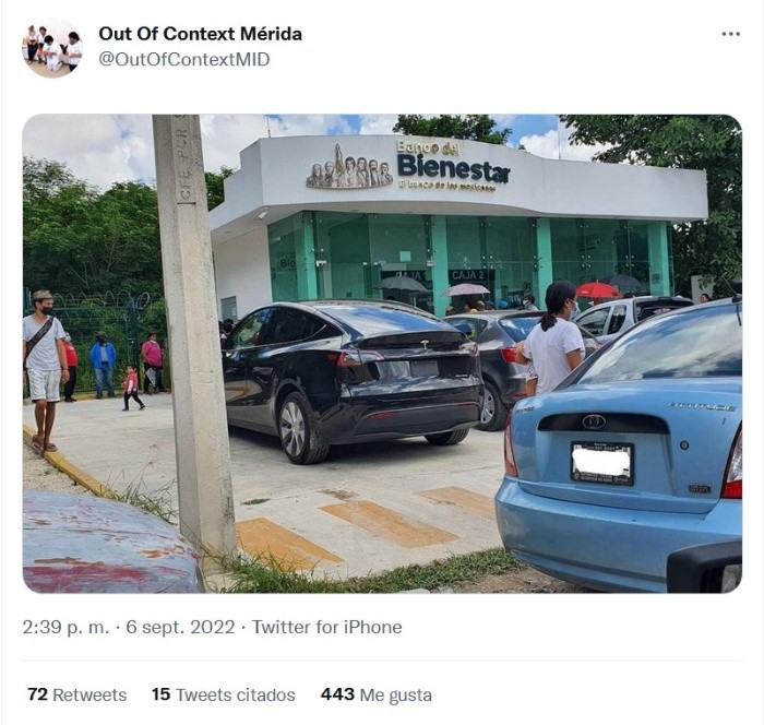 Un usuario captó un lujoso Tesla modelo X presuntamente estacionado afuera de un Banco del Bienestar; la imagen causó polémica en redes y rápidamente internautas emitieron su opinión sobre la imagen.En redes sociales se viralizó rápidamente la fotografía de un automóvil Tesla modelo X estacionado afuera de un Banco del Bienestar ubicado en el estado Yucatán, en Mérida.De acuerdo con medios locales, el conductor de este vehículo presuntamente fue a cobrar su pensión, sin embargo, esto no ha sido confirmado.La imagen se ha compartido en las redes con gran velocidad logrando acumular gran variedad de comentarios que han generado polémica. Estas son algunas de las opiniones:“Pobrecito, seguro le hace falta el dinero para pagar su tesla”.“Aquí humildemente con mi Tesla”.“¡Están buenos los apoyos del Banco del Bienestar!”Hasta el momento se desconoce el motivo por el cual el coche está estacionado en el lugar o si la imagen es auténtica; sin embargo, las especulaciones siguen dando de qué hablar en las redes.JM