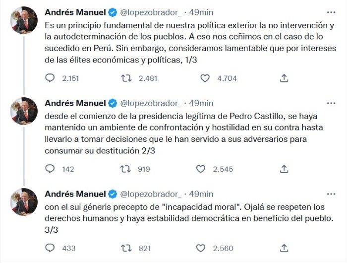 El Presidente Andrés Manuel López Obrador, acusó a las "élites económicas y políticas" de Perú de forzar al ahora exmandatario peruano Pedro Castillo a "tomar decisiones" que derivaron en su destitución este miércoles."Consideramos lamentable que por intereses de las élites económicas y políticas, desde el comienzo de la presidencia legítima de Pedro Castillo, se haya mantenido un ambiente de confrontación y hostilidad en su contra hasta llevarlo a tomar decisiones que le han servido a sus adversarios para consumar su destitución", expresó en Twitter.El Mandatario tachó de "sui géneris" el concepto de "incapacidad moral" que utilizaron este miércoles los diputados peruanos para destituir a Castillo, quien se encuentra en la sede de la prefectura de la Policía de Lima, poco después de ser destituido por el Congreso y ser mayoritariamente acusado de haber intentado perpetrar un golpe de Estado.Las declaraciones de López Obrador ocurren momentos después de revelarse que el Gobierno de México está dispuesto a ofrecer asilo a Castillo, aunque el expresidente peruano no lo ha solicitado, según reveló el canciller Marcelo Ebrard en una entrevista con Radio Fórmula.López Obrador pidió que "ojalá se respeten los derechos humanos y haya estabilidad democrática en beneficio del pueblo".En otras ocasiones, el Presidente ha expresado su solidaridad con Castillo al denunciar que había "racismo" detrás del intento de la "élite" y los "conservadores" de destituirlo.Incluso, pospuso la cumbre de la Alianza del Pacífico que debía realizarse el 25 de noviembre en Ciudad de México, por la negativa del Congreso peruano de permitir la asistencia de Castillo, quien debía recibir la presidencia del bloque comercial.El Mandatario defendió su derecho de opinar sobre lo ocurrido en Perú, pese a que ha insistido a lo largo de su mandato que él no interviene en asuntos internos de otros países."Es un principio fundamental de nuestra política exterior la no intervención y la autodeterminación de los pueblos. A eso nos ceñimos en el caso de lo sucedido en Perú", aseveró.JM