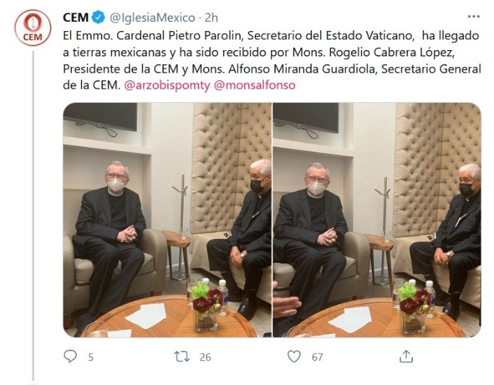El secretario de Estado del Vaticano, el cardenal Pietro Parolin, llegó este jueves a México para una visita de cinco días, que incluirá una reunión con el Presidente Andrés Manuel López Obrador (AMLO) en Palacio Nacional el próximo lunes.La Conferencia del Episcopado Mexicano (CEM) informó la llegada de Parolin, quien fue recibido por el presidente del Episcopado, Rogelio Cabrera López; y por el secretario general de la CEM, Alfonso Miranda Guardiola.El pasado lunes, la Arquidiócesis Primada de México, al dar a conocer la visita, señaló que aunque la de Parolin no era una visita oficial, "debido al alto rango del secretario de Estado, que equivale a un primer ministro, el Presidente mexicano ha invitado al cardenal a tener este encuentro personal".Según la agenda divulgada por la CEM, el próximo sábado presidirá la ordenación episcopal del sacerdote yucateco Fermín Sosa Rodríguez, quien fue nombrado por el Papa Francisco como nuncio apostólico en Papúa Nueva Guinea, principal motivo de su visita.El domingo 20 de junio tiene programada la celebración de la misa del mediodía en la Basílica de Guadalupe, junto al cardenal Carlos Aguiar Retes, arzobispo primado de México.El lunes, tras la reunión con AMLO, el cardenal será nombrado "huésped distinguido" por la jefa de Gobierno de la Ciudad de México, Claudia Sheinbaum.Posteriormente participará en una recepción que ofrecerá la Nunciatura Apostólica con motivo del Día del Papa y por la noche viajará de regreso a Roma.JM