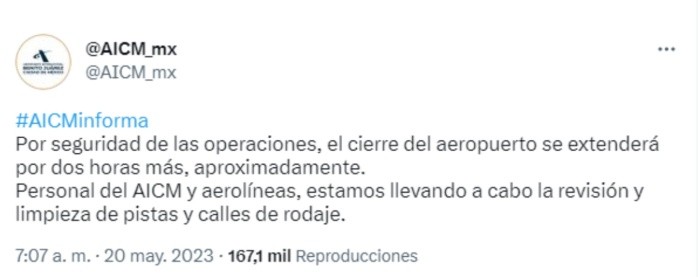 Las operaciones en el Aeropuerto Internacional de la Ciudad de México (AICM) fueron suspendidas debido a la presencia de ceniza arrojada por el volcán Popocatépetl, a partir de las 04:25 horas de este sábado, así lo informó la misma terminal aérea a través de la cuenta oficial de Twitter.Alrededor de las 07:00 de la mañana, el AICM indicó que por seguridad de las operaciones, el cierre del aeropuerto se extendería por dos horas más, aproximadamente, mientras personal de la terminal aérea y de líneas aéreas realizan la limpieza de pistas y calles de rodaje.La constante actividad del Popocatépetl y la caída de ceniza en los últimos días, son los principales factores para que los despegues y aterrizajes hayan tenido que ser interrumpidos.Usuarios de las redes sociales empiezan a manifestar su inconformidad, ya que mencionan que hay poca información al respecto.El pasado 28 de abril, también fueron suspendidas las actividades del Aeropuerto Internacional de Puebla ‘Hermanos Serdán’, de 9:40 a 14:00 horas, debido a la caída de ceniza que presentaba la entidad.En tanto, Aeroméxico invitó a sus usuarios a tomar precauciones y consultar el estatus de su vuelo a través de: https://viaja.am/3DXy22A.A su vez, Volaris reportó afectaciones en algunos de sus viajes, por lo que también sugirió a los usuarios consultar el estatus de sus vuelos en http://volaris.com/flightstatus, y que en caso de que su vuelo se vea afectado contactarlos por mensaje directo.Mientras que Viva Aerobús pidió a sus usuarios estar pendientes de las indicaciones de las autoridades, así como de las actualizaciones sobre sus vuelos, y compartió este enlace para revisar el estatus de sus vuelos bit.ly/viva-estatus.El Aeropuerto Internacional Felipe Ángeles (AIFA) suspendió operaciones por caída del volcán Popocatépetl desde las 05:58 horas de este sábado.A través de redes sociales, el AIFA informó que "por presencia de ceniza volcánica, el aeropuerto cerró operaciones a partir de las 05:58 horas. Ya se tomaron medidas para limpieza de pistas y reanudar operaciones. Seguiremos informando". OF