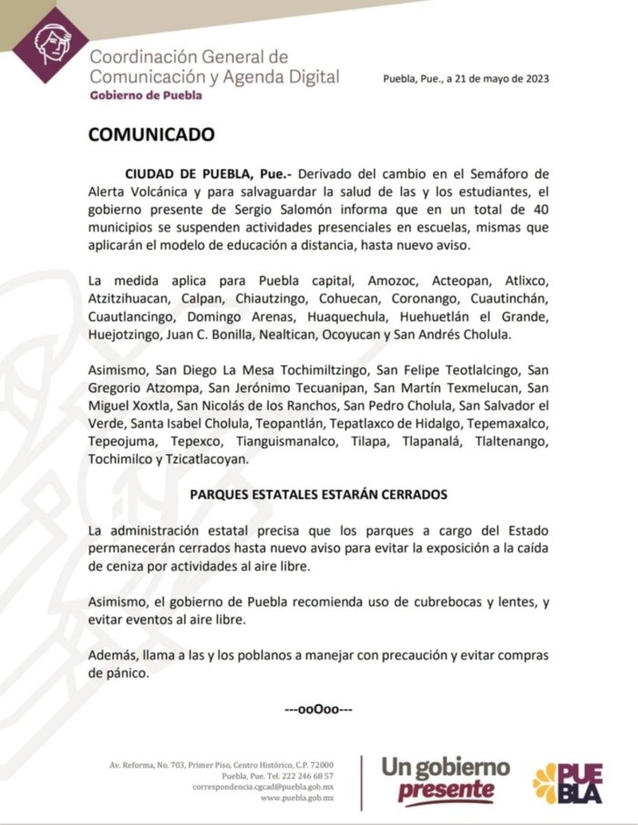 Sergio Salomón Céspedes, gobernador de Puebla, informó que un total de 40 municipios suspenden actividades presenciales en escuelas derivadas del cambio en el Semáforo de Alerta Volcánica por el Popocatépetl.Lo anterior se da con el objetivo de salvaguardar la salud de las y los estudiantes en los diferentes niveles educativos y que se reanudarán hasta nuevo aviso. Sin embargo, las clases virtuales continúan.Una gruesa capa de ceniza del volcán Popocatépetl cubrió durante la madrugada y mañana de este domingo al menos una docena de municipios, entre ellos los de la zona conurbada de la ciudad de Puebla.Las calles, avenidas, viviendas y automóviles amanecieron cubiertos de ceniza, lo que sorprendió a miles de habitantes, quienes compartieron en redes sociales las imágenes.En los municipios de Puebla, Cuautlancingo, San Pedro y San Andrés Cholula, Atlixco, entre otros, registraron fuerte caída de ceniza, como no se había presentado en años.La Coordinación General de Protección Civil del Gobierno de Puebla alertó que la caída de ceniza del volcán Popocatépetl seguirá registrándose en distintas regiones del estado de Puebla.Y es que el volcán ha presentado desde la madrugada episodios de tremor constante con emisiones de gases y ceniza de forma permanente.Por la dirección del viento, la ceniza va hacia los valles de Puebla y Atlixco, donde desde las primeras horas de este día se registró una intensa caída de ceniza.
