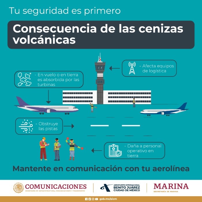Luego de que el Gobierno de la Ciudad de México informara que, ante el cambio a la Fase 3 del Semáforo Amarillo de la Alerta Volcánica por la actividad del Popocatépetl, el riesgo para la capital es la caída de ceniza, se prevé que puedan cancelarse más vuelos.Aeropuerto Internacional de la Ciudad de México (AICM) dio a conocer por medio de redes sociales que "ante presencia de cenizas volcánicas las operaciones pueden suspenderse eventualmente".Detalló que volar en esas condiciones podría ocasionar afectaciones a avión que no le permitiría el viaje.El AICM publicó que algunas de las consecuencias de viajar mientras cae ceniza volcánica estarían, además de los daños a la salud, las complicaciones aeronáuticas como: Bloquear los controles de vuelo, afectar antenas de comunicaciones y dañar las turbinas.Explicó en sus redes sociales que "en vuelo o en tierra la ceniza sería absorbida por las turbinas", "afectaría equipos de logística", "obstruiría pistas" y "dañaría a personal operativo en tierra".