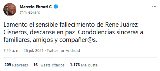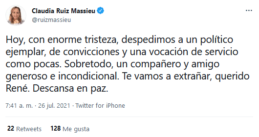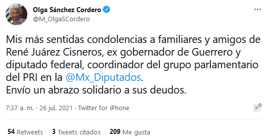 El coordinador de los diputados mexicanos del Partido Revolucionario Institucional (PRI), René Juárez Cisneros, murió tras contraer COVID-19, informaron este lunes sus compañeros."Hoy, con enorme tristeza, despedimos a un político ejemplar, de convicciones y una vocación de servicio como pocas. Sobre todo, un compañero y amigo generoso e incondicional. Te vamos a extrañar, querido René", expresó en redes la senadora del PRI y excanciller Claudia Ruiz Massieu.Juárez Cisneros estaba grave desde mayo después de anunciar su contagio el 21 de abril.Su deceso ocurre en medio de la tercera ola de COVID-19 que afronta México, que acumula casi 2.75 millones de casos y más de 238 mil muertes, la cuarta cifra más alta del mundo.El coronavirus ha sacudido la Cámara de Diputados, que reportó un total de 581 casos de COVID-19 hasta marzo, de los que 102 eran legisladores y 479 trabajadores.El caso de Juárez ha destacado porque fue presidente del PRI, el antiguo partido hegemónico de México, y gobernador de Guerrero.Su deceso conmocionó a la clase política, y el gabinete del Presidente, Andrés Manuel López Obrador, lamentó su muerte."Mis más sentidas condolencias a familiares y amigos de René Juárez Cisneros, exgobernador de Guerrero y diputado federal, coordinador del grupo parlamentario del PRI en la Cámara de Diputados. Envío un abrazo solidario", indicó Olga Sánchez Cordero, titular de la Secretaría de Gobernación (Segob).A estos deseos se sumaron Tatiana Clouthier, la secretaria de Economía, y Marcelo Ebrard, secretario de Relaciones Exteriores.La enfermedad ya había provocado la muerte de dos diputados: Miguel Acundo del Partido Encuentro Solidario (PES) y Delfino López del Movimiento Regeneración Nacional (Morena).También fallecieron por covid-19 dos senadores de Morena, Joel Molina y Radamés Salazar.Asimismo, se han infectado casi 20 de los 32 gobernadores, incluyendo a la alcaldesa de Ciudad de México, Claudia Sheinbaum.También se han contagiado los titulares de la Secretaría de Hacienda, de Energía, de Agricultura y Desarrollo Rural, de Seguridad, de la Función Pública y del Instituto Mexicano del Seguro Social (IMSS), entre otros.GC