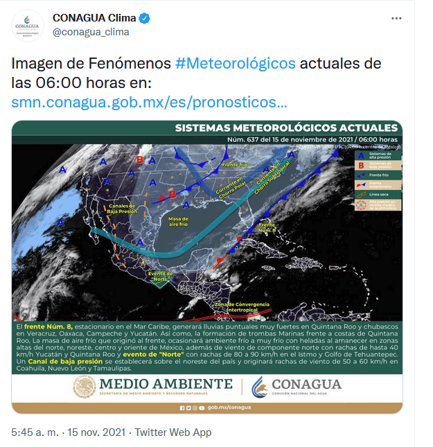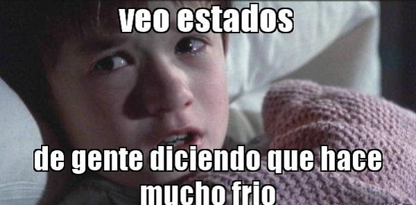 El invierno todavía no inicia en el hemisferio norte, sin embargo, el clima ha sorprendido a los mexicanos por el cambio tan drástico que ha sufrido los últimos días.Aunque es día festivo en México, puente, y los alumnos no tuvieron clases y muchos empleados disfrutan del día de asueto, quienes tuvieron que levantarse temprano para trabajar se dieron cuenta de que la mañana ha estado más fría que en los últimos días, y esto tiene una explicación. De acuerdo con el Servicio Meteorológico Nacional (SMN), para este lunes 15 de noviembre se pronostica que el frente frío número ocho se mantenga estacionario sobre el Mar Caribe y genere condiciones para lluvias puntuales muy fuertes en Quintana Roo, así como chubascos en Veracruz, Oaxaca, Campeche y Yucatán. Por otro lado, la masa de aire frío que originó el frente ocasionará ambiente frío a muy frío con heladas al amanecer en zonas altas del norte, noreste, centro y oriente del país. Estas condiciones afectan poco a Jalisco, donde se han tenido amanecer muy fríos los últimos días.El evento de "Norte", con vientos de 80 a 90 km/h afecta el Istmo y el Golfo de Tehuantepec, donde el oleaje alcanza de dos a cuatro metros de altura. Además, un canal de baja presión se establecerá este día sobre el noreste del país, originará rachas de viento de 50 km/h a 60 km/h en Coahuila, Nuevo León y Tamaulipas. En el resto del territorio mexicano se pronostica ambiente diurno templado a cálido y baja probabilidad de lluvia.El SMN, en su reporte de las 06:00 horas, indicó que se pronostican temperaturas mínimas de -5 a 0 grados con heladas en zonas montañosas de Chihuahua, Durango, Zacatecas, Guanajuato, Querétaro, Hidalgo, Michoacán, Estado de México, Tlaxcala y Puebla; mientras que prevén mínimas de 0 a 5 grados con posibles heladas en zonas montañosas de Sonora, Coahuila, Nuevo León, San Luis Potosí, Aguascalientes, Jalisco, Veracruz, Oaxaca, Guerrero, Ciudad de México y Chiapas.El Instituto de Astronomía y Meteorología de la Universidad de Guadalajara (UdeG) detalló que este lunes, la Zona Metropolitana de Guadalajara amanece con cielo despejado, y que se espera un día mayormente soleado con algunas nubes. El ambiente es frío a primeras horas de la mañana y madrugada. Piden tomar precauciones por los contrastes térmicos entre horas al amanecer y la tarde, pues se esperan temperaturas máximas de 25 a 27 grados.El clima frío ha llegado a México y por supuesto, con él los memes.OF