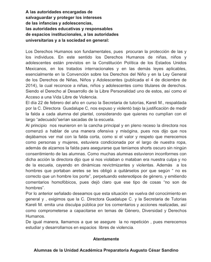 La escuela preparatoria Augusto César Sandino, de Culiacán, Sinaloa enfrenta una polémica en redes sociales y la opinión pública luego de que sus alumnas denunciaran una serie de actos que violentaron sus derechos y les obligaron a firmar una polémica responsiva.Según lo denunciado en redes sociales, el pasado 22 de febrero un grupo de alumnas fue reunido para que autoridades escolares midieran la longitud de las faldas de sus uniformes, así como a mostrar que el short que portaban debajo fuera del color reglamentario. Además algunas fueron obligadas a firmar una responsiva en la que asumen su responsabilidad en caso de agresión sexual."Les voy a decir lo que le dijeron a unas amigas: Por traer las faldas "cortas" las querían sacar y pues al final les dijeron "si quieren venir bichis, anótense en esta lista, y ya afuera no es nuestro problema si las violan", señala una alumna en una de las publicaciones al respecto.En otra de las denuncias una alumna indica que "revisaron el color del short de abajo de la falda porque es obligatorio traerlo oscuro, y a las que mandaron a tutorías les hicieron firmar una carta responsiva de que si las violaban o mataban fuera de la escuela ya no era culpa de la escuela"."El día 22 de febrero del año en curso la Secretaria de tutorías, Kareli M., respaldada por la C. Directora Guadalupe C. nos expuso y violentó bajo la justificación de medir la falda a cada alumna del plantel, considerando que quienes no cumplían con el largo "adecuado" serían sacadas de la escuela", se lee en la circular que las estudiantes hicieron llegar a autoridades."Al principio nos reunieron en la cancha principal y en pleno receso la directora nos comenzó a hablar de manera ofensiva y misógina, pues nos dijo que nos dejábamos ver mal con la falda corta, como si el valor y respeto que merecemos como personas y mujeres, estuviera condicionada por el largo de nuestra ropa, además de alzarnos la falda para asegurarse que teníamos short oscuro sin ningún consentimiento de las alumnas", relatan.Un video en TikTok muestra el supuesto momento en que una mujer sostiene una regla con la que mide la distancia entre la rodilla y el vuelo de la falda de algunas alumnas. Además, circulan capturas de pantalla de diversos mensajes, incluso uno de una conversación en el que la pareja de una alumna señala "pues mi novia va ahí (Sandino) en tercero y le hicieron que se bajara la falda (...) y le hicieron firmar algo que si la violaban no era culpa de la prepa".De inmediato las alumnas dieron a conocer la situación también entre colectivos debido a lo delicado del contexto en el que la preparatoria volvía obligatoria la medida; de igual manera el plantel prohíbe a los varones el uso de aretes o ‘piercings’, tachando de machistas las medidas que persisten en el plantel.Ante la denuncia en redes, la colectiva “No se Metan con Nuestras Hijas” emitió un mensaje de apoyo a la comunidad estudiantil y solicitó la intervención de la Comisión Estatal de Derechos Humanos en Sinaloa e hizo un llamado al rector de la Universidad Autónoma de Sinaloa (UAS), a la que pertenece dicho plantel, a garantizar el respeto a los derechos humanos de estudiantes.Por su parte, la Organización No Gubernamental (ONS) Girl Up Sinaloa (@amapasdelnorte) se solidarizó con las alumnas y llamó al combate de la discriminación, victimización y violencia por parte de las autoridades del plantel.Pese a que el caso llegó a la CEDH, hasta el momento las autoridades de la preparatoria Augusto César Sandino o de la UAS no han emitido su postura al respecto ni atendido el llamado a ofrecer disculpas a la comunidad estudiantil afectada por dichas prácticas, solicitada en la circular firmada por las Alumnas de la Unidad Académica Preparatoria Augusto César Sandino.