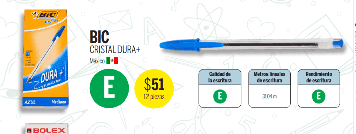 Mes con mes, la Revista del Consumidor de la Profeco revela cuáles son los mejores productos para todos los consumidores y este mes de agosto, previo al regreso a clases, se han dado a la tarea de analizar cuáles son las mejores plumas que todos los estudiantes deben llevar en sus bolsillos.En un estudio realizado por la Procuraduría Federal del Consumidor, se analizaron 29 cuadernos, gomas para borrar, pegamento líquido y de barra; reglas de plástico, tijeras, barras de plastilina; lápices y bolígrafos de tinta azul. Pero en esta ocasión hablaremos únicamente de los bolígrafos que valen la pena respecto a calidad-precio.Una de las experiencias más desagradables es cuando abres la mochila o la bolsa y ves la gran mancha de tinta azul. Para que esto no suceda, lo mejor es comprar aquellos productos avalados por la Procuraduría Federal del Consumidor.En el estudio se analizaron bolígrafos de tinta azul oleosa punto mediano sin mecanismo retráctil y con mecanismo retráctil de distintas marcas, entre ellas BIC, Bolex, Peper Mate, entre otras. De los once modelos analizados, la Profeco consideró que la mejor pluma es la BIC Cristal Dura +, ya que ofrece 3 mil 104 metros lineales de escritura, con calidad en cada trazo y un precio módico por paquee de 12 piezas de 51 pesos.Ahora bien, las 5 mejores plumas por debajo de la BIC Cristal Dura + son las siguientes:Por su parte, la peor pluma que puedes tener entre tus cosas de papelería, es la MAE Rapid Ink BTM-A. Ésta ofrece 745 meros lineales de escritura, es decir, una tercera parte de lo que ofrecen las BIC. El precio de la MAE Rapid es de 65 pesos por 12 piezas.