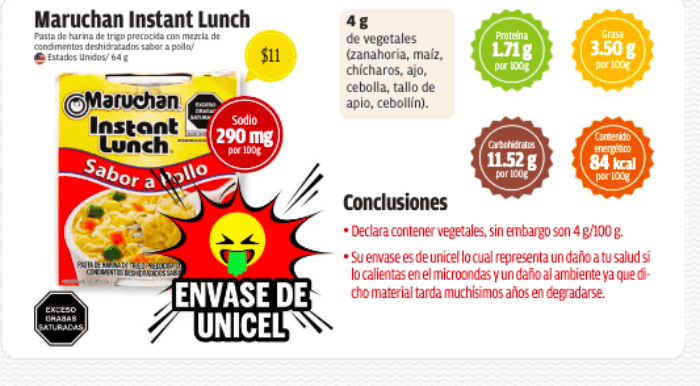 Las sopas instantáneas llevan años siendo opciones populares y asequibles por lo fáciles que son: basta con calentar un poco de agua, unos cuantos minutos en el microondas, y es un placebo inmediato para el hambre. De acuerdo con la Profeco, México es el segundo consumidor en Latinoamérica de sopas instantáneas, lo que puede repercutir de modo negativo en la salud de los mexicanos. Si bien ninguna sopa instantánea es saludable como tal, sí hay opciones que son "mejores" que otras, incluso que la popular Maruchan, que no resultó tan bien calificada por la Profeco. De acuerdo con el estudio de la Profeco, una de las mejores opciones de sopa instantánea se trata de la Nissin Maxi Sopa, pues cumple con el contenido que especifica en su etiqueta, contiene menor cantidad de grasa, y no es comercializada en recipientes de unicel, que son uno de los más dañinos para la salud. No obstante, la Profeco especifica que la Nissin Maxi Sopa tiene exceso en grasas saturadas, y exceso en sodio. La Maruchan no salió tan bien calificada, pues no informa de modo adecuado sus componentes. Pues afirma tener vegetales, pero en realidad solo 4 g; está presentada en unicel, que al calentarse en microondas expulsa químicos dañinos, y tiene también el ingrediente de glutamato monosódico, relacionado con problemas de salud, pero que "reafirma" los sabores de la sopa. Sin importar qué opción sea "mejor" que otra, la Profeco ha resaltado que las sopas instantáneas no nutren, y que el sabor que aportan es a base de saborizantes artificiales nocivos para la salud.FS