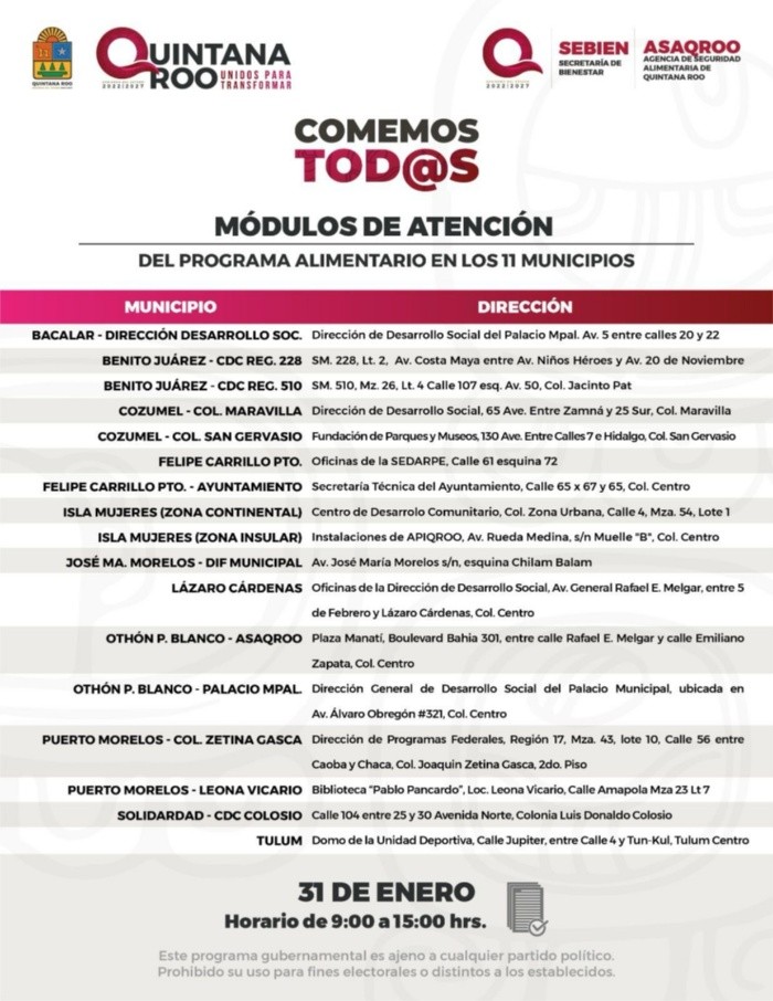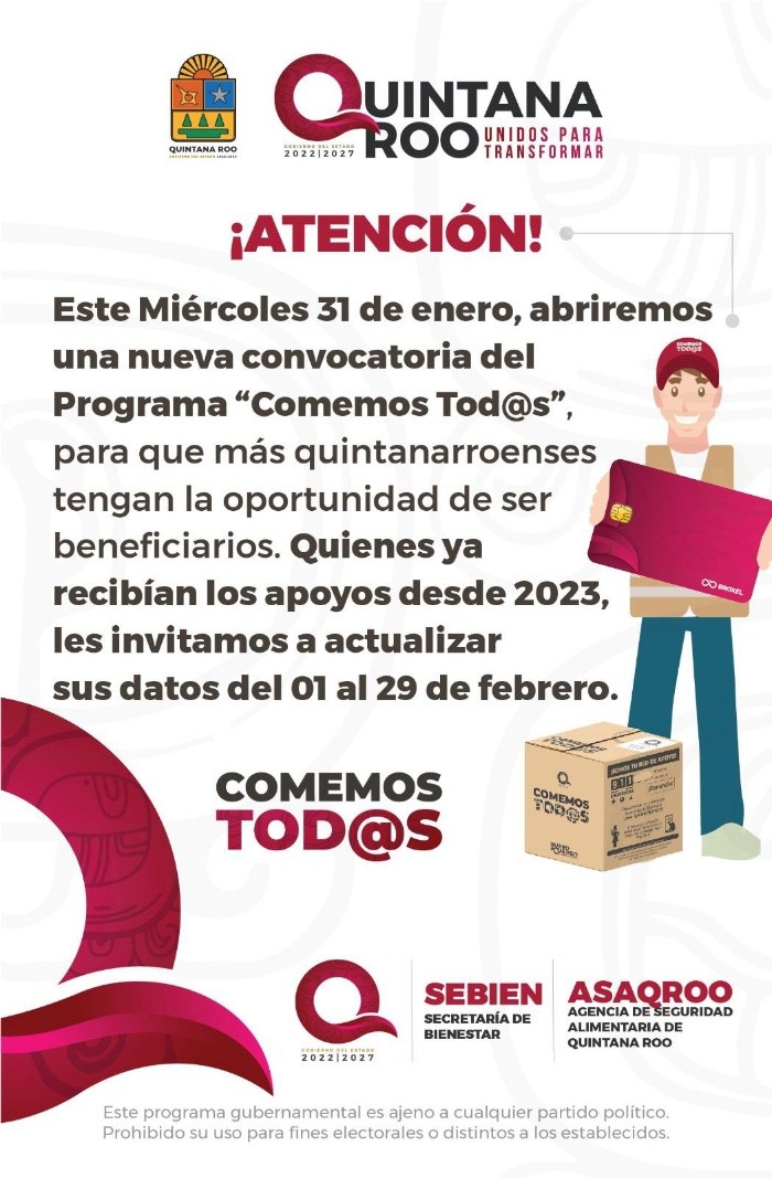 La página del programa “Comemos Todas y Todos 2024” ya se encuentra habilitada para todas aquellas personas del estado de Quintana Roo que quieran realizar su registro.Dicho programa es impulsado por la Secretaría del Bienestar y se creó con el objetivo de salvaguardar la seguridad alimentaria de las familias de Quintana Roo.El apoyo está dirigido a mujeres y hombres que sean los responsables del hogar y que de ellos dependan otras personas, como hijos, personas mayores, con discapacidad, o con alguna enfermedad crónica degenerativa.Se les brindará a las personas que resulten beneficiarias una canasta básica, y un mes después se les depositará mil 350 pesos de forma mensual, con los cuales podrán adquirir alimentos, medicina y de ser necesario útiles escolares. Para realizar el trámite, necesitarás ingresar a la siguiente página https://qroo.gob.mx/sebien/comemostodasytodos/ y seguir cada uno de los pasos que pide la plataforma.Pero también tienes otra opción, pues puedes hacerlo de forma presencial; necesitarás acudir a las oficinas de la Secretaría del Bienestar en Cancún y Chetumal.Además, se habilitarán módulos en algunos municipios de Quintana Roo.Si estás interesado en inscribirte o ya formas parte del programa, tienes hasta el 29 de febrero para realizar el trámite.NA