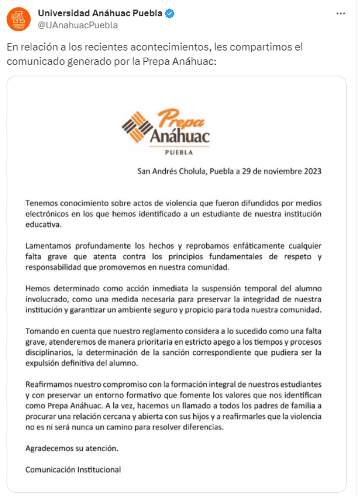Un joven, quien fue identificado como alumno de la Universidad Anáhuac, golpeó a un guardia de seguridad privada, solo por que le solicitó identificarse y al no hacerlo correctamente, se negó a levantar la pluma de acceso en un inmueble de Lomas de Angelópolis, Puebla.Los hechos quedaron grabados por cámaras de seguridad y por una conductora de una camioneta que pasaba por el lugar. Los videos, que circulan en redes sociales, muestran cómo el joven se lanza a golpes al guardia de seguridad privada.En otro de los videos, el agresor pide a una conductora que deje de grabarlo, asegurando que fue el guardia quien primero lo atacó, pero éste señala que nunca lo tocó y que todo estaba captado por las cámaras de la caseta.-¡A mí no me vuelvas a pegar!-Hay cámaras, hay cámaras, yo nunca te toqué, le dice el guardia. Enseguida, entran un par de hombres que intervienen para tratar de calmarlo, mientras que la conductora les dice que necesita entrar y que debe mover su auto.En un tercer video el joven sigue con actitud agresiva, ya que lo estaban conteniendo al parecer otros hombres que presuntamente serían parte de la seguridad del lugar.Usuarios en redes identificaron al agresor como alumno de la Universidad Anáhuac, por lo que la institución educativa lanzó un comunicado confirmandolo y para informar que el joven sería suspendido temporalmente y que se analizará si amerita la suspensión definitiva."Lamentamos profundamente los hechos... Hemos determinado como acción inmediata la suspensión temporal del alumno involucrado... Tomando en cuenta que nuestro reglamento considera a lo sucedido como una falta grave, atenderemos de manera prioritaria en estricto apego a los tiempos y procesos disciplinarios, la determinación de la sanción correspondiente que pudiera ser la expulsión definitiva del alumno", se lee en el documento difundo por la preparatoria Anáhuac en redes sociales.FS
